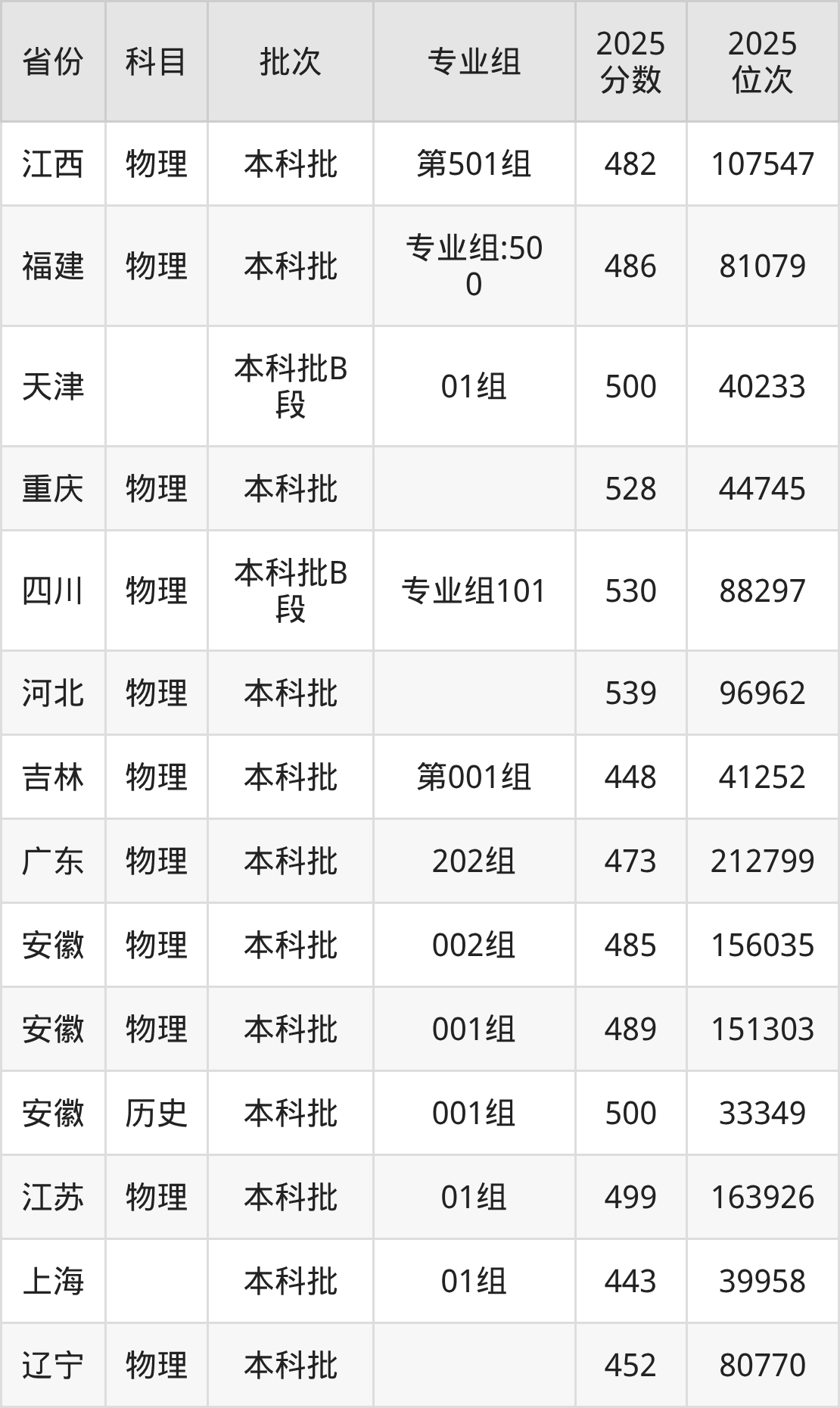 2025年在本科物理类进行招生,各专业组分数线详情如下: