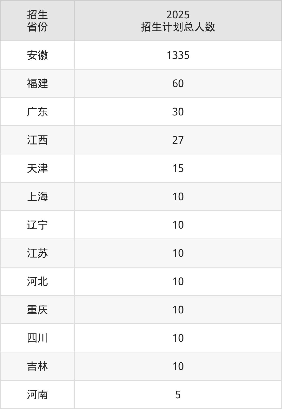 2025年安徽医科大学临床医学院面向全国13个省市开展本科招生;招生专业共14个,招生人数共1542人。2025年在安徽省招生计划总人数是1335人,其中,安徽医科大学临床医学院在安徽省招生人数最多的是临床医学。安徽医科大学临床医学院在各省具体招生人数情况如下表。
