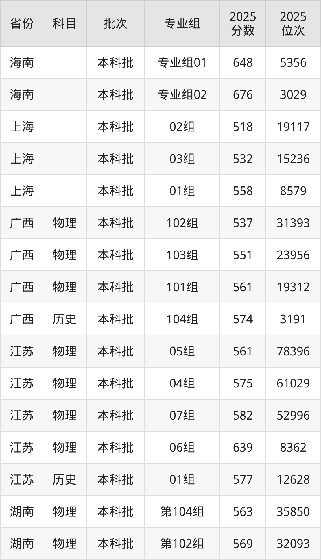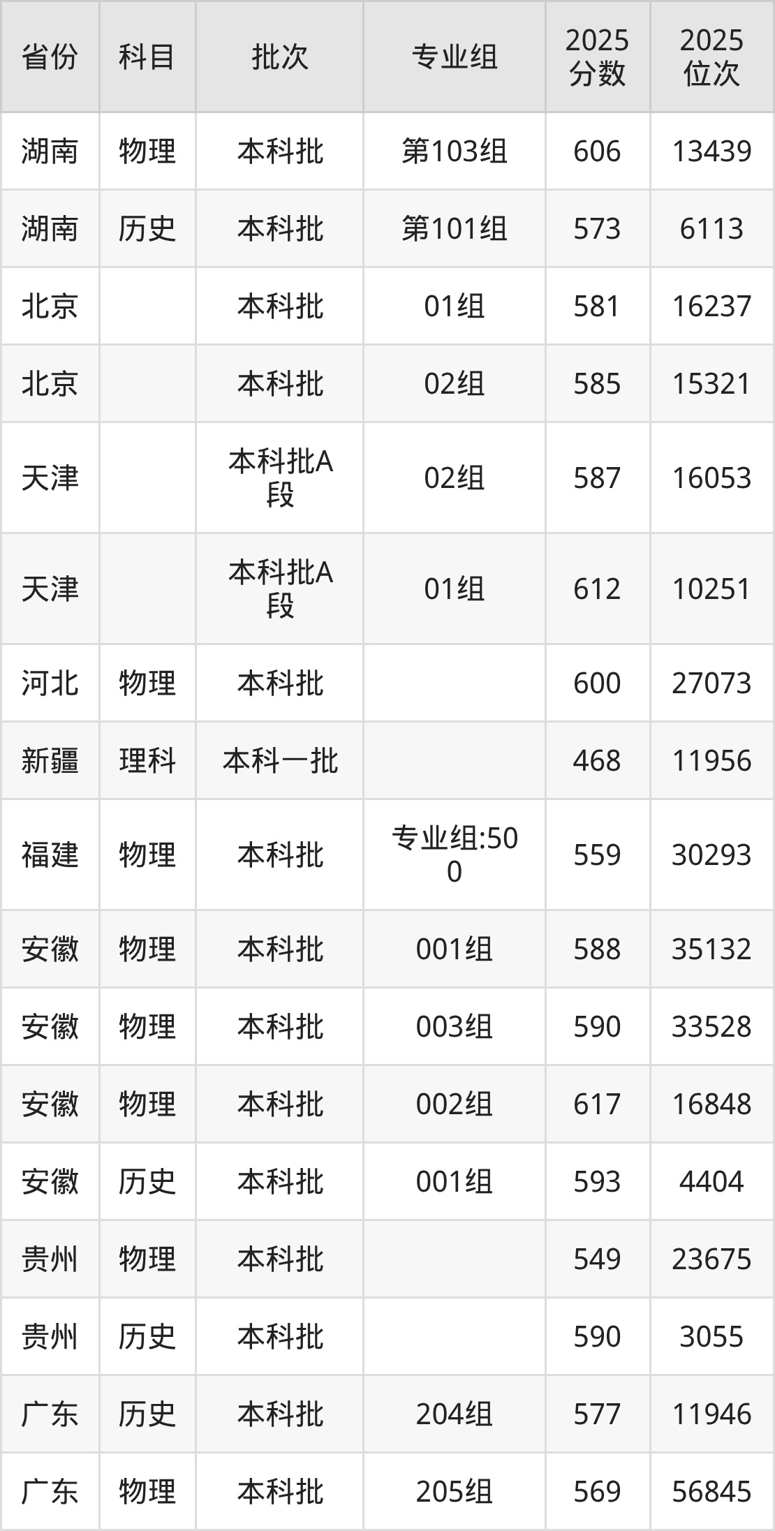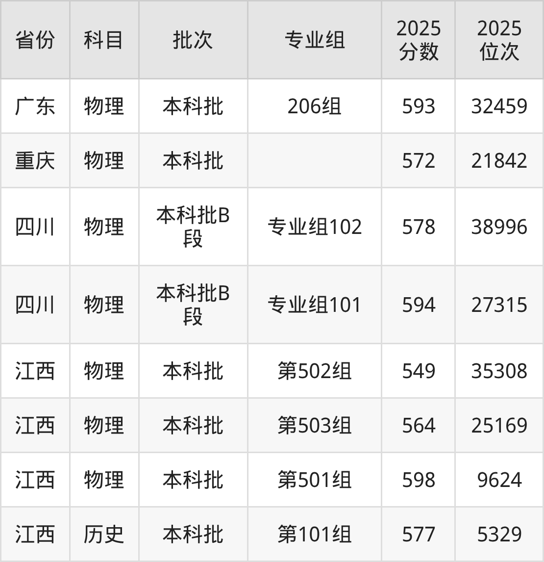 2025年在本科物理类进行招生,各专业组分数线详情如下: