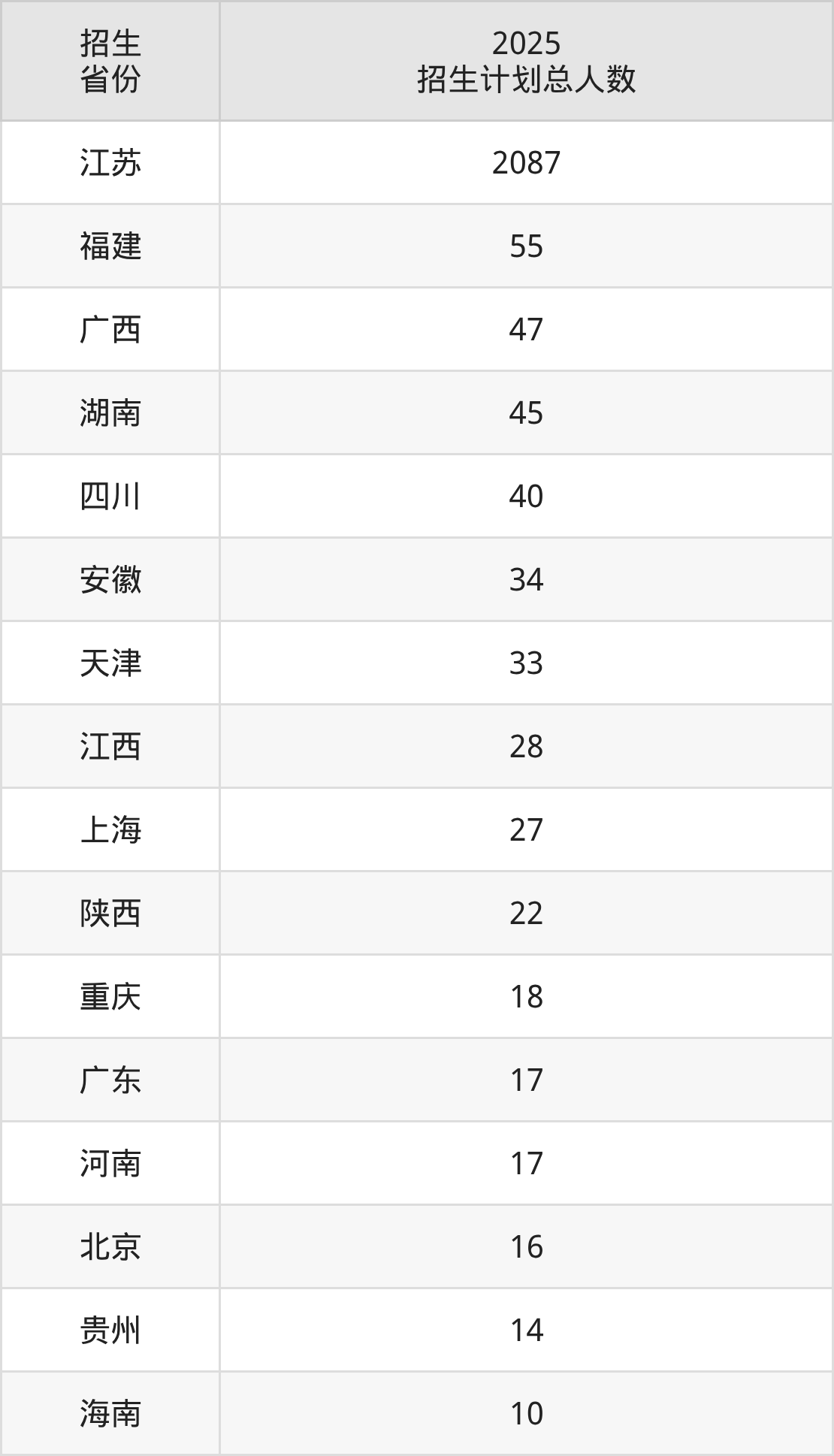 2025年南京医科大学面向全国20个省市开展本科招生;招生专业共25个,招生人数共2530人。2025年在江苏省招生计划总人数是2087人,其中,南京医科大学在江苏省招生人数最多的是临床医学。南京医科大学在各省具体招生人数情况如下表。