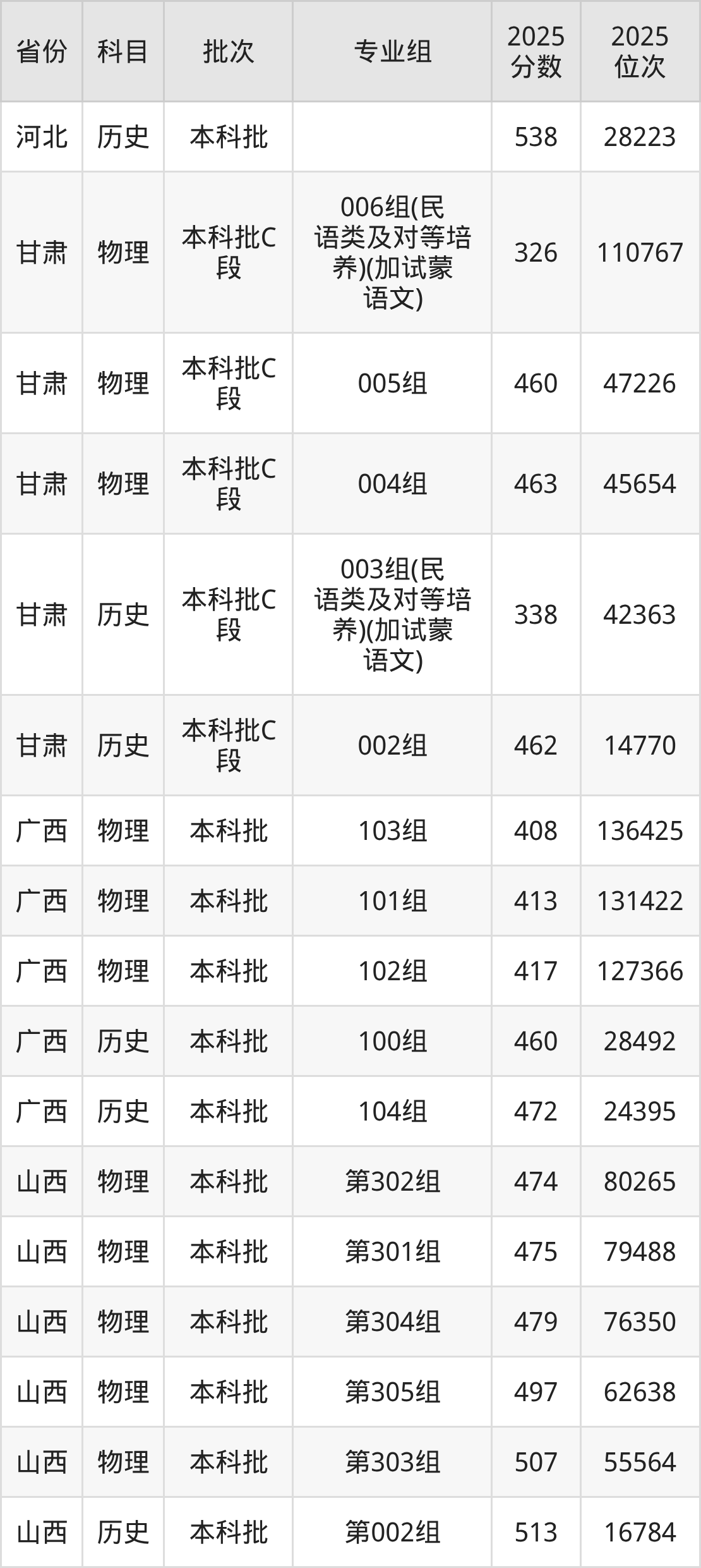 下面是2025年内蒙古师范大学全国录取分数线一览表,请查阅。