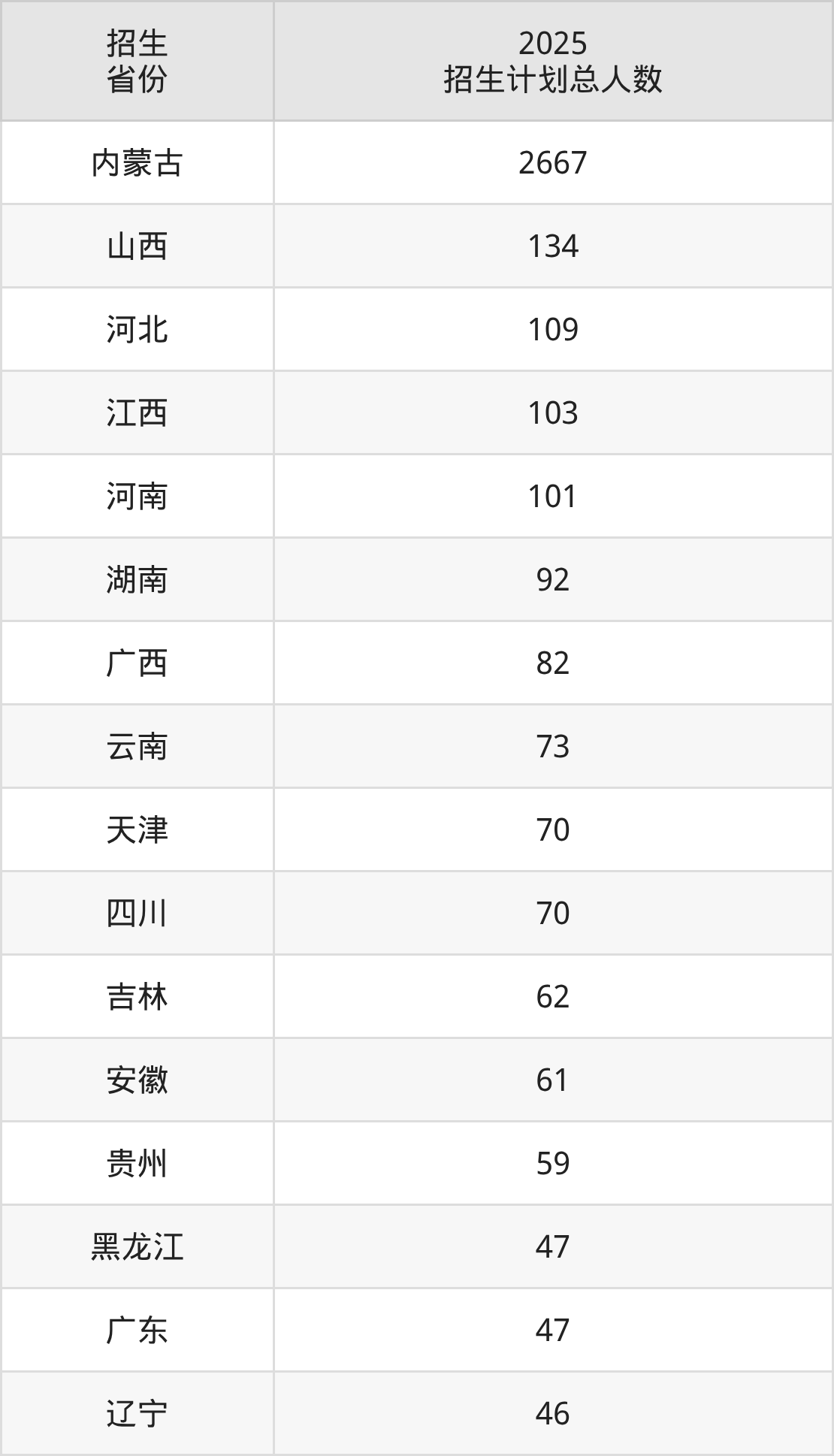 2025年内蒙古师范大学面向全国25个省市开展本科招生;招生专业共57个,招生人数共4047人。2025年在内蒙古自治区招生计划总人数是2667人,其中,内蒙古师范大学在内蒙古自治区招生人数最多的是汉语言文学。内蒙古师范大学在各省具体招生人数情况如下表。