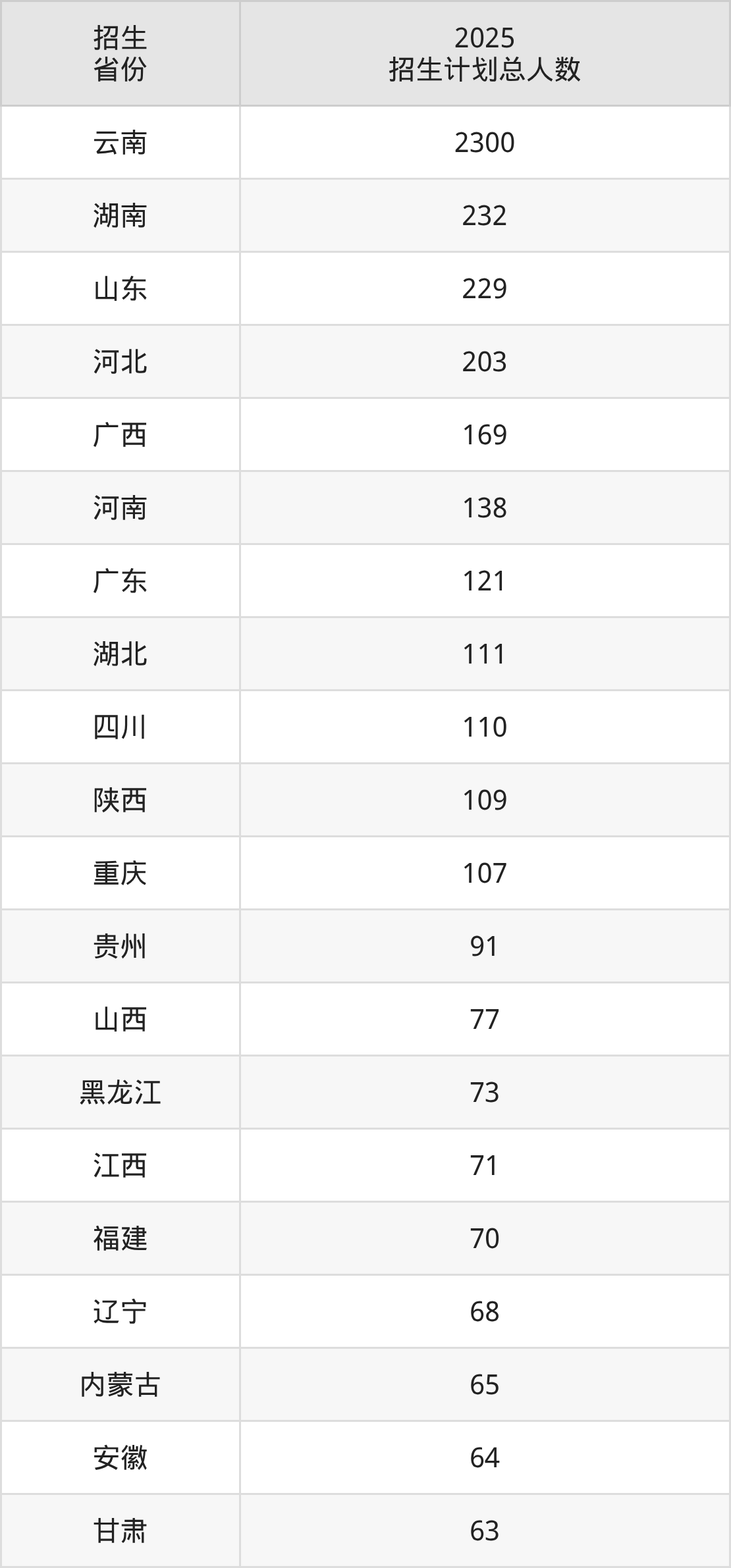 2025年云南大学面向全国29个省市开展本科招生;招生专业共66个,招生人数共4718人。2025年在云南省招生计划总人数是2300人,其中,云南大学在云南省招生人数最多的是化学类。云南大学在各省具体招生人数情况如下表。