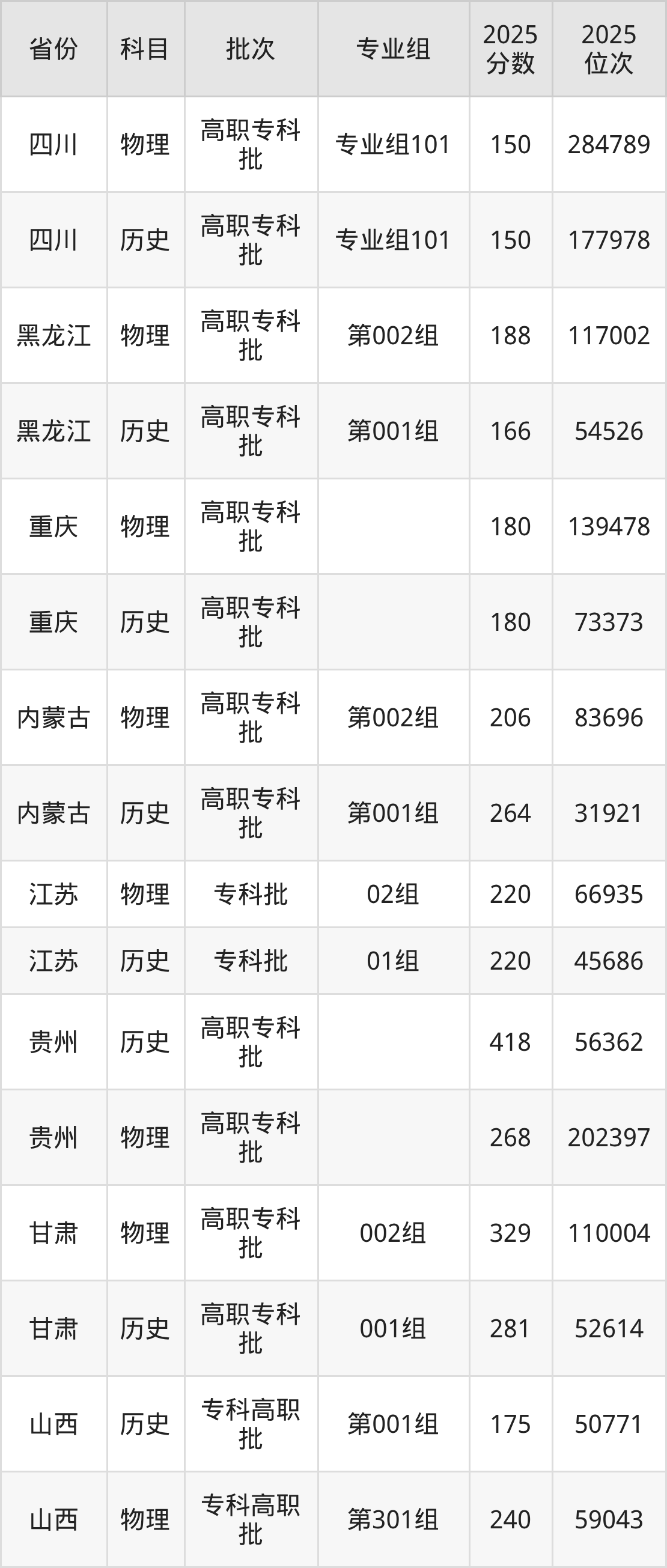 2025年烟台黄金职业学院全国录取分数线是150分到418分,录取最低在四川物理类(专业组101)、录取最高在贵州历史类。各省各专业组最低分具有差异,详情如下: