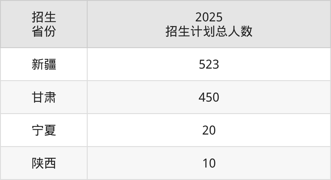 2025年昌吉职业技术学院面向全国4个省市开展专科招生;招生专业共54个,招生人数共1003人。2025年在新疆维吾尔自治区招生计划总人数是523人,其中,昌吉职业技术学院在新疆维吾尔自治区招生人数最多的是临床医学。昌吉职业技术学院在各省具体招生人数情况如下表。