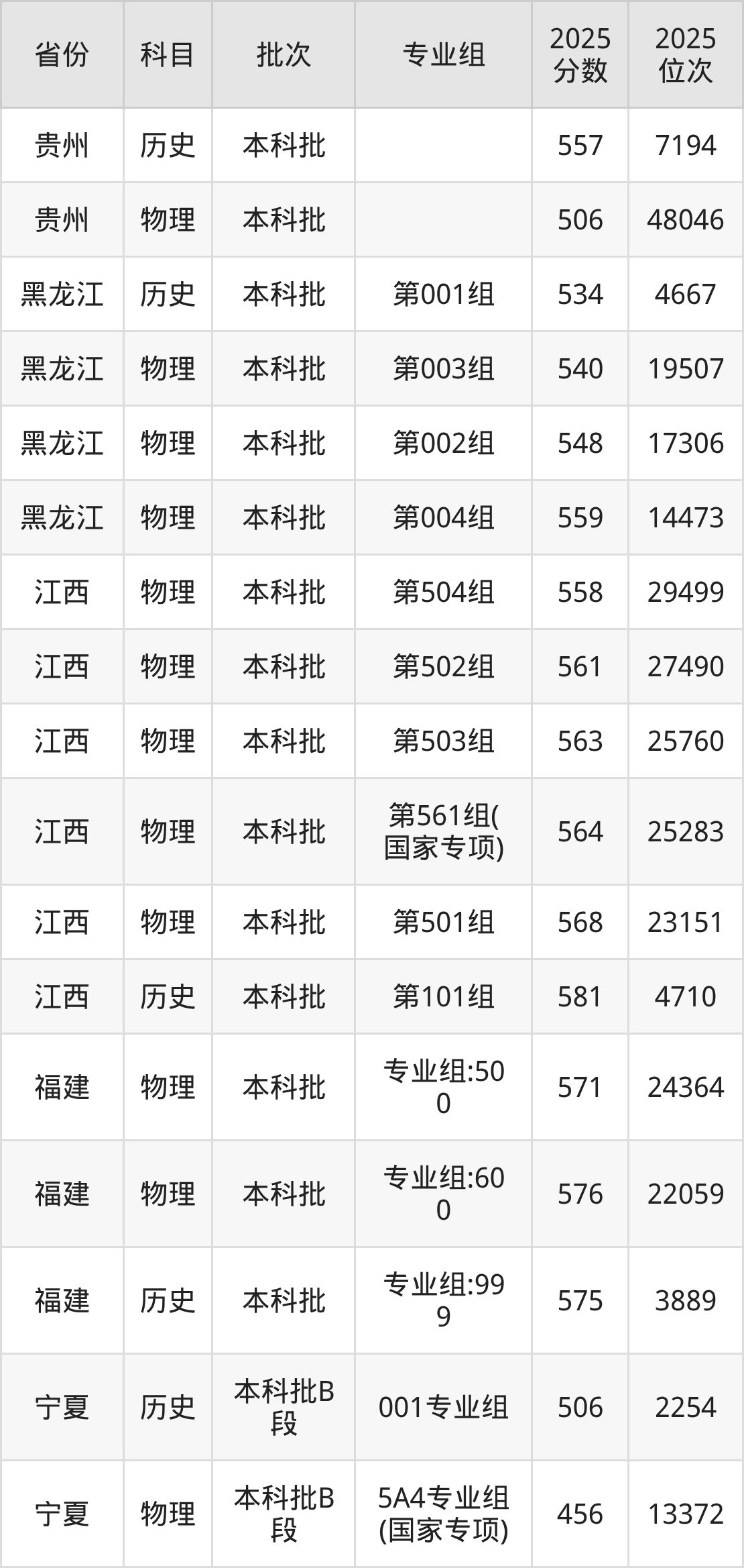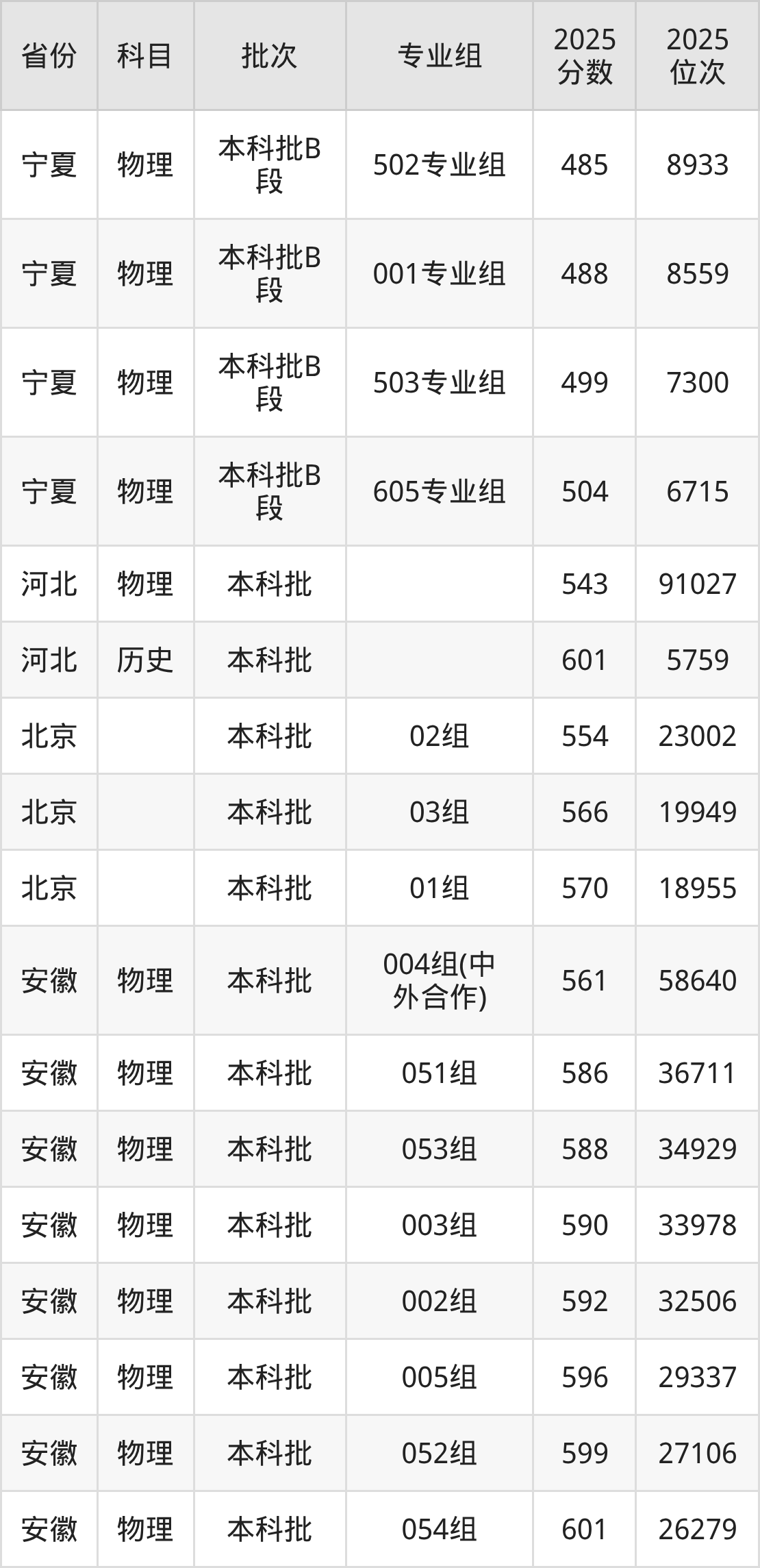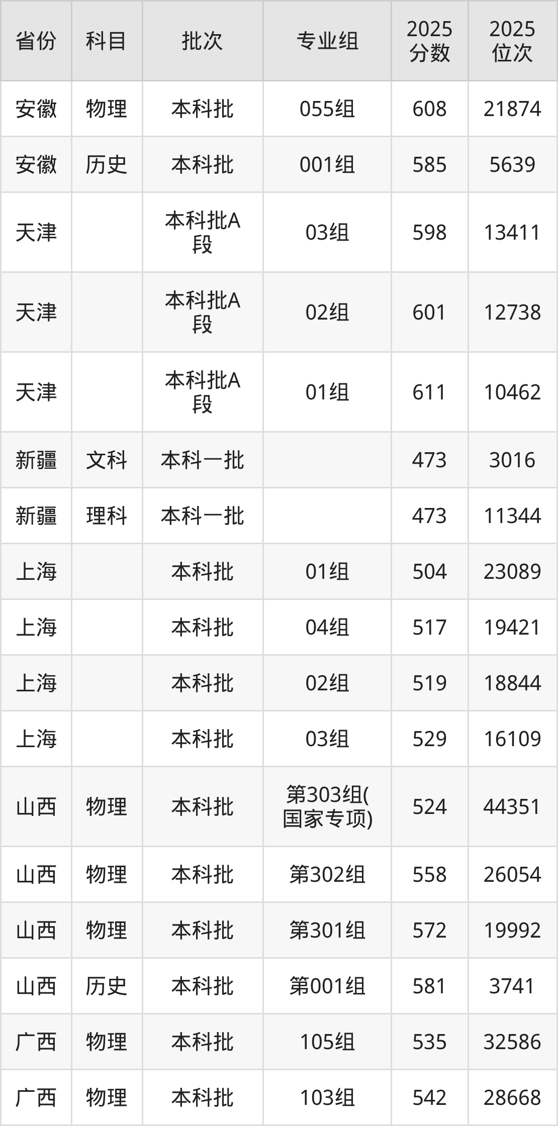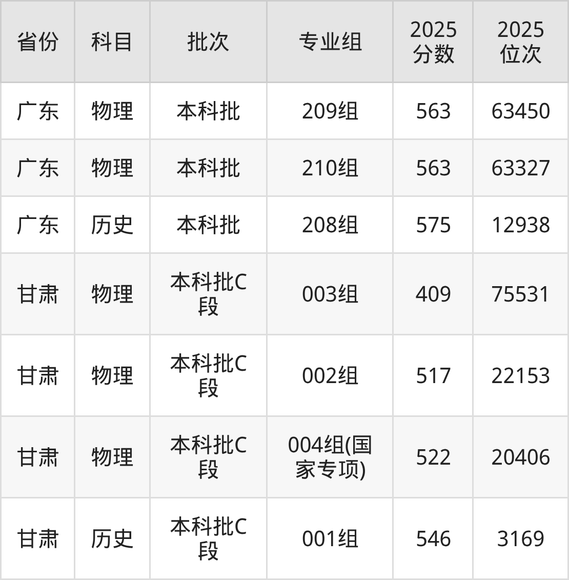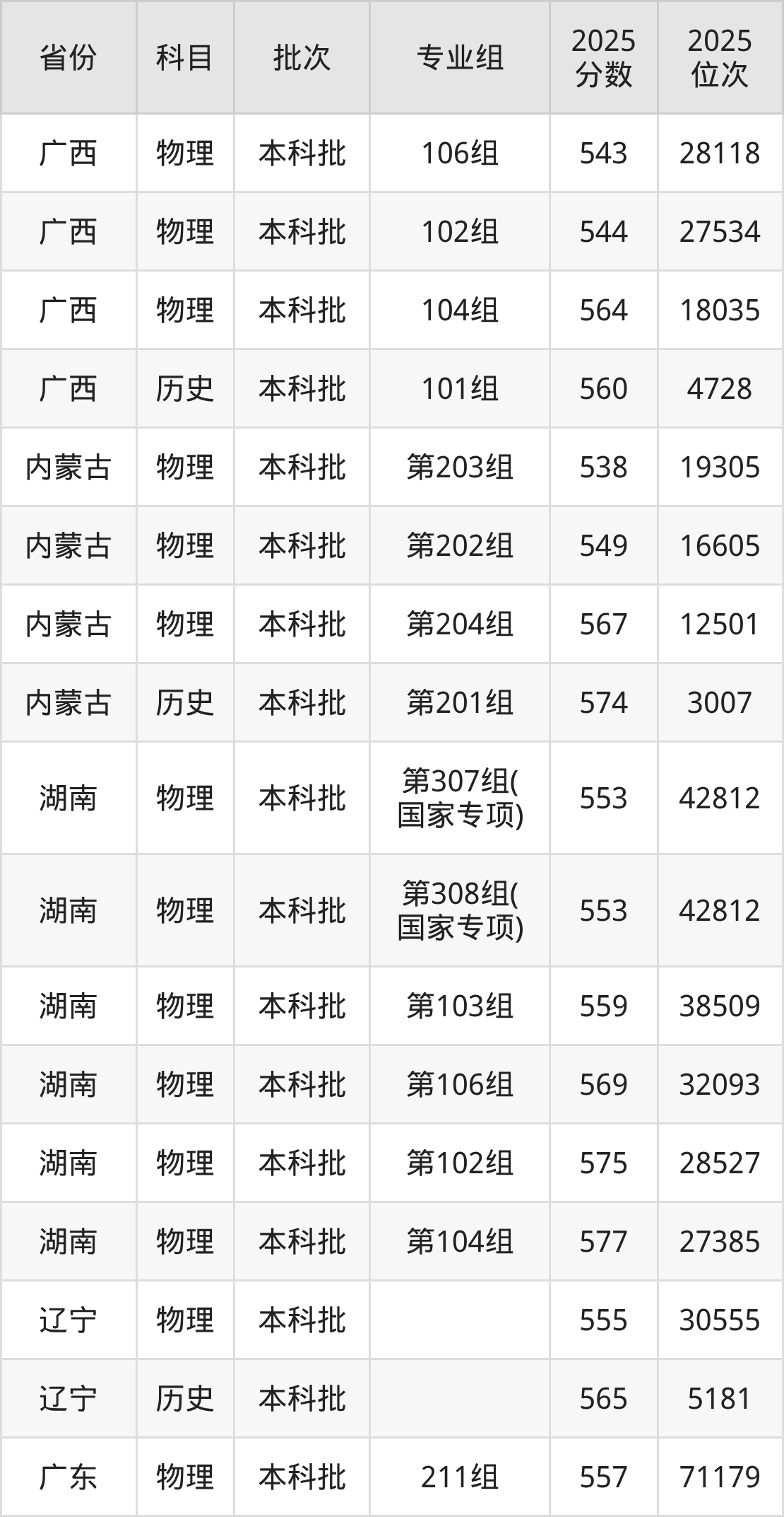 2025年在本科物理类进行招生,各专业组分数线详情如下: