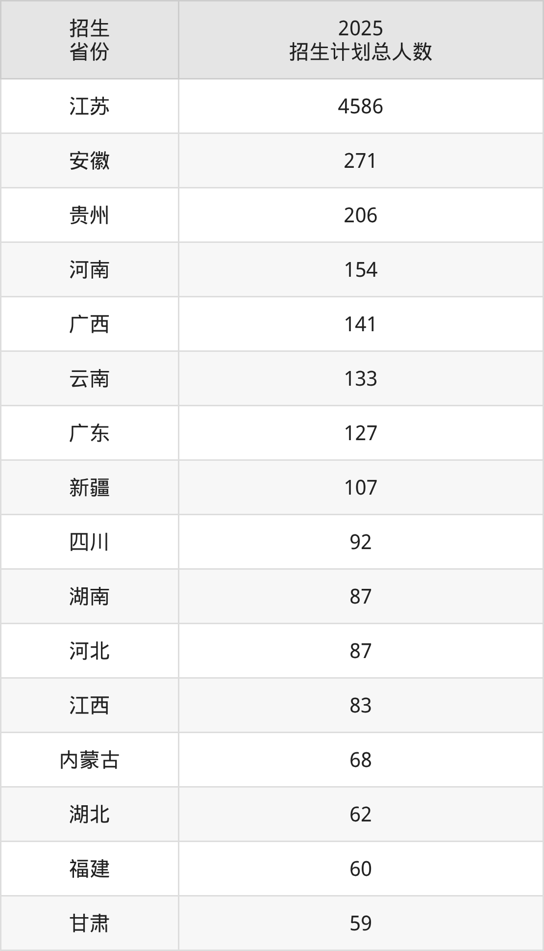 2025年南京林业大学面向全国28个省市开展本科招生;招生专业共69个,招生人数共6693人。2025年在江苏省招生计划总人数是4586人,其中,南京林业大学在江苏省招生人数最多的是机械设计制造及其自动化。南京林业大学在各省具体招生人数情况如下表。