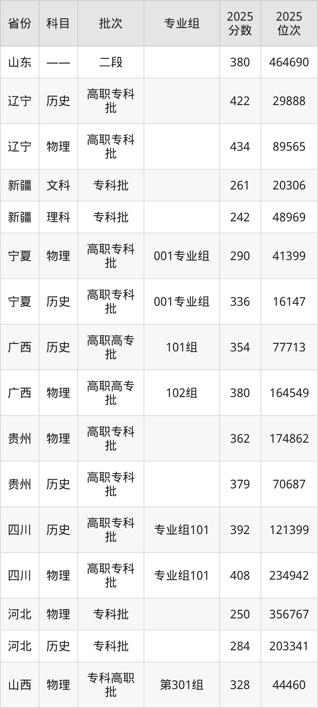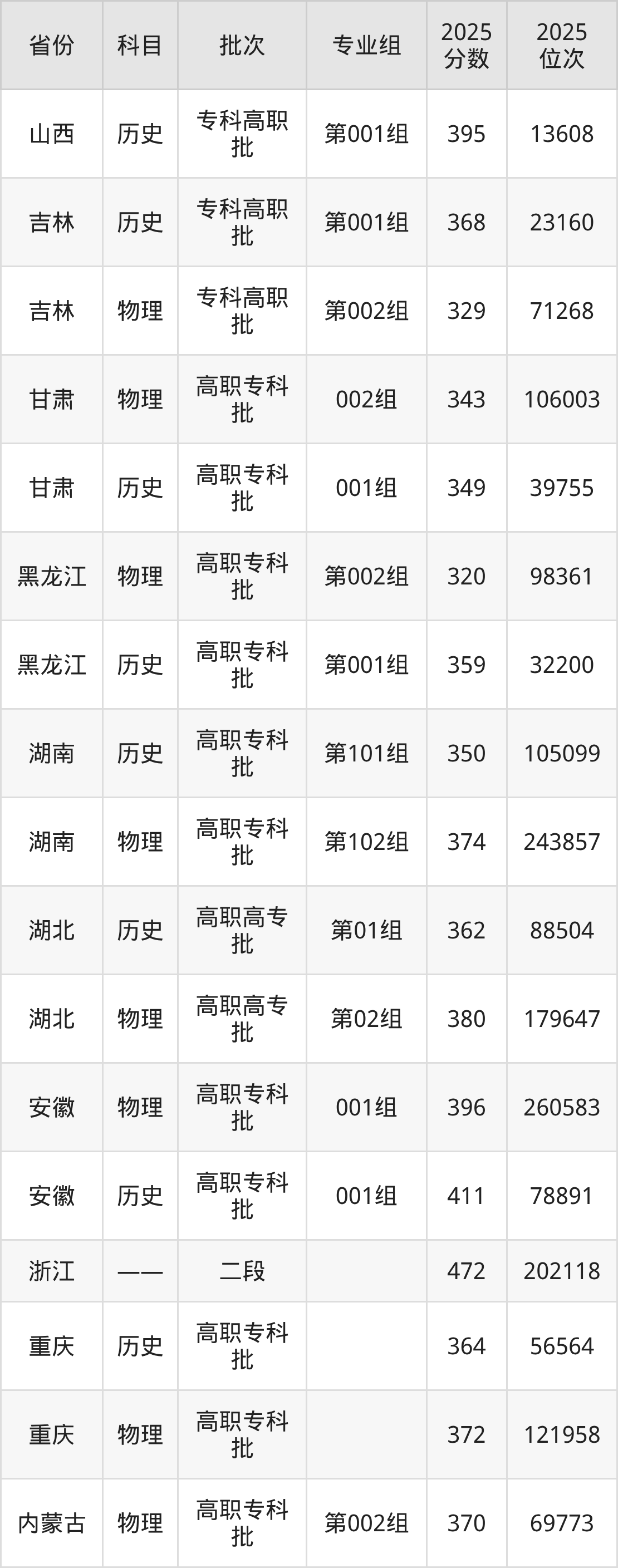 普通类专科物理类最低329分,专科历史类最低368分