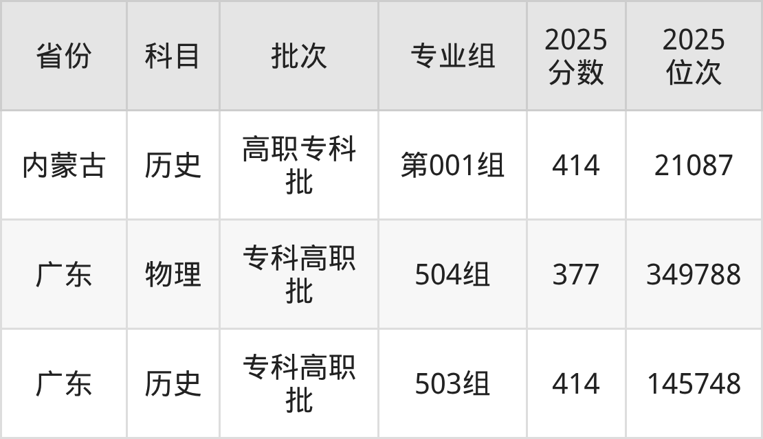 石家庄人民医学高等专科学校001组:2025年投档录取最低分为396分,录取最低位次为260583名。