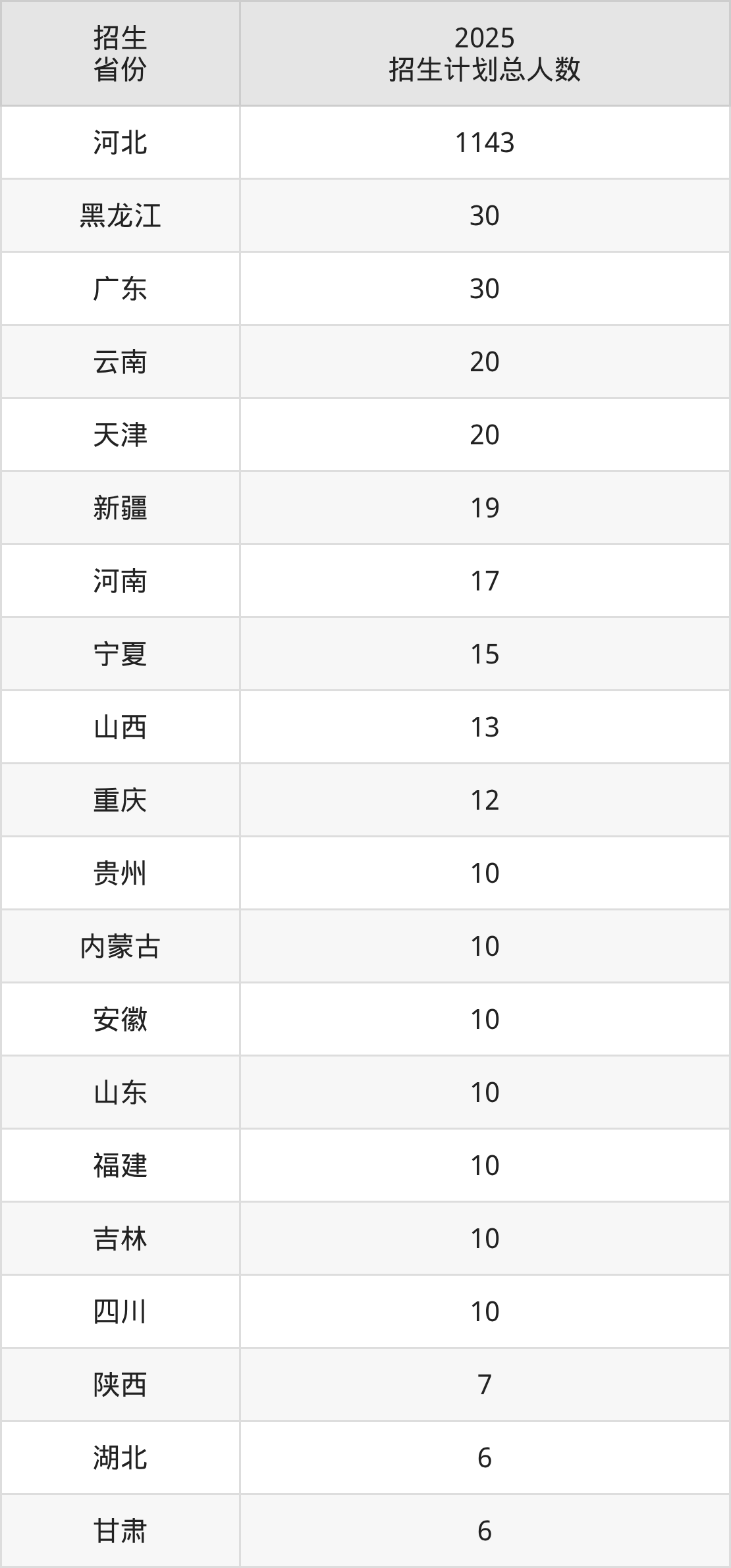 2025年石家庄人民医学高等专科学校面向全国25个省市开展专科招生;招生专业共11个,招生人数共1434人。2025年在河北省招生计划总人数是1143人,其中,石家庄人民医学高等专科学校在河北省招生人数最多的是护理。石家庄人民医学高等专科学校在各省具体招生人数情况如下表。