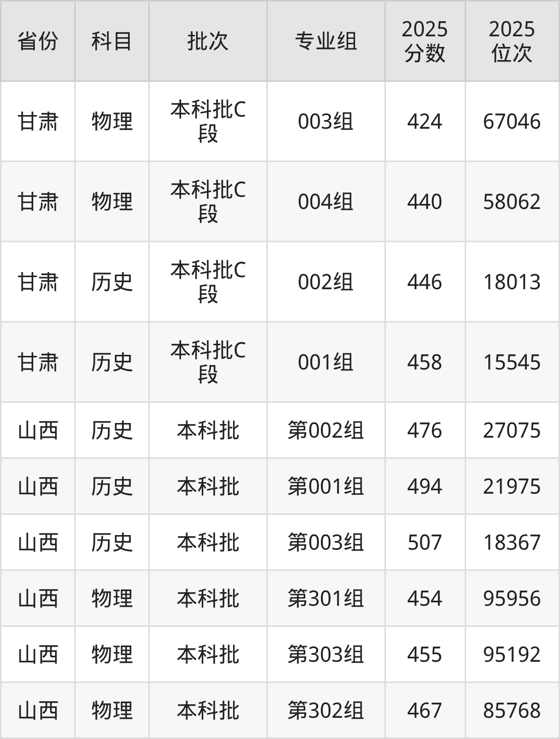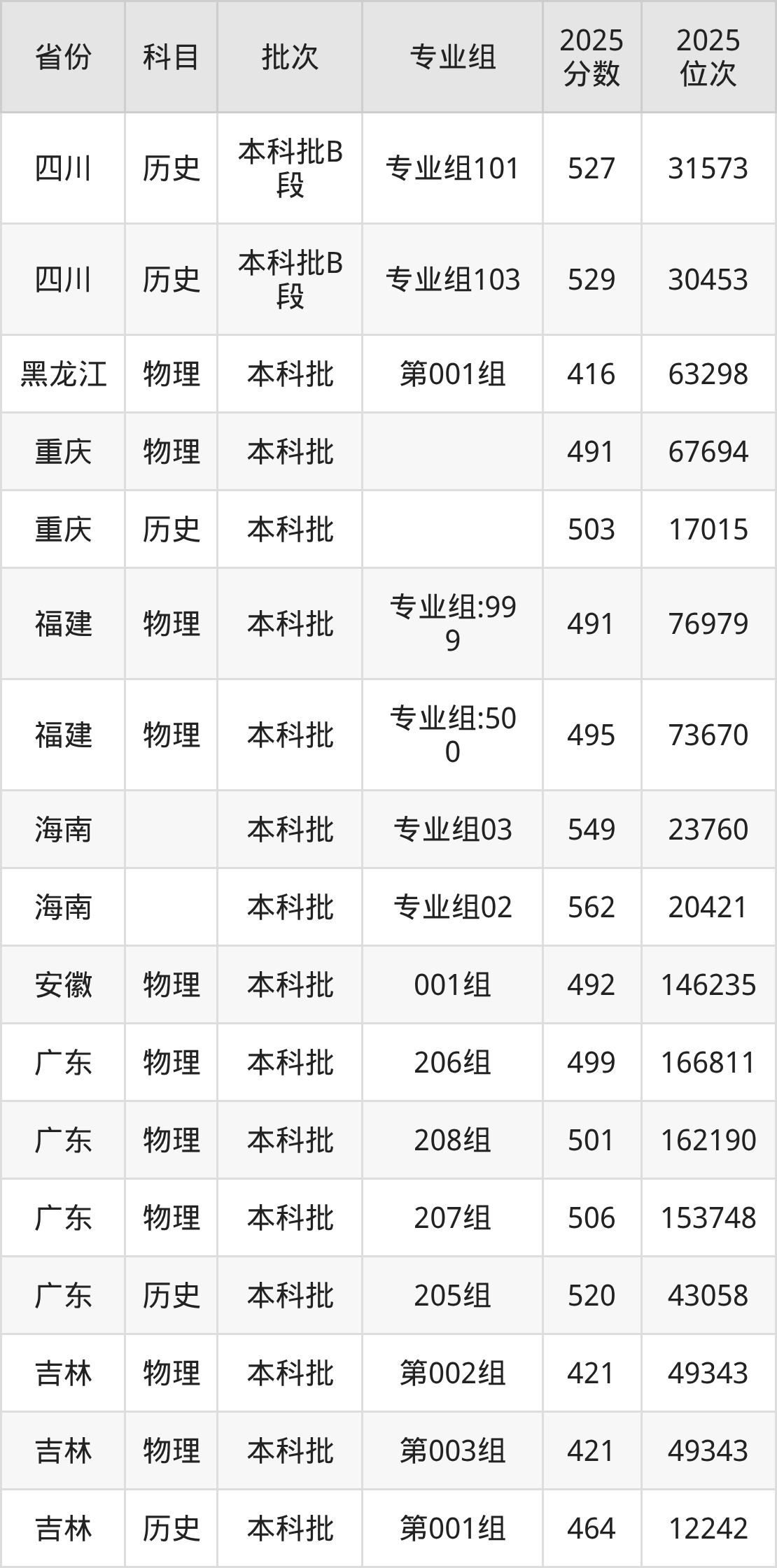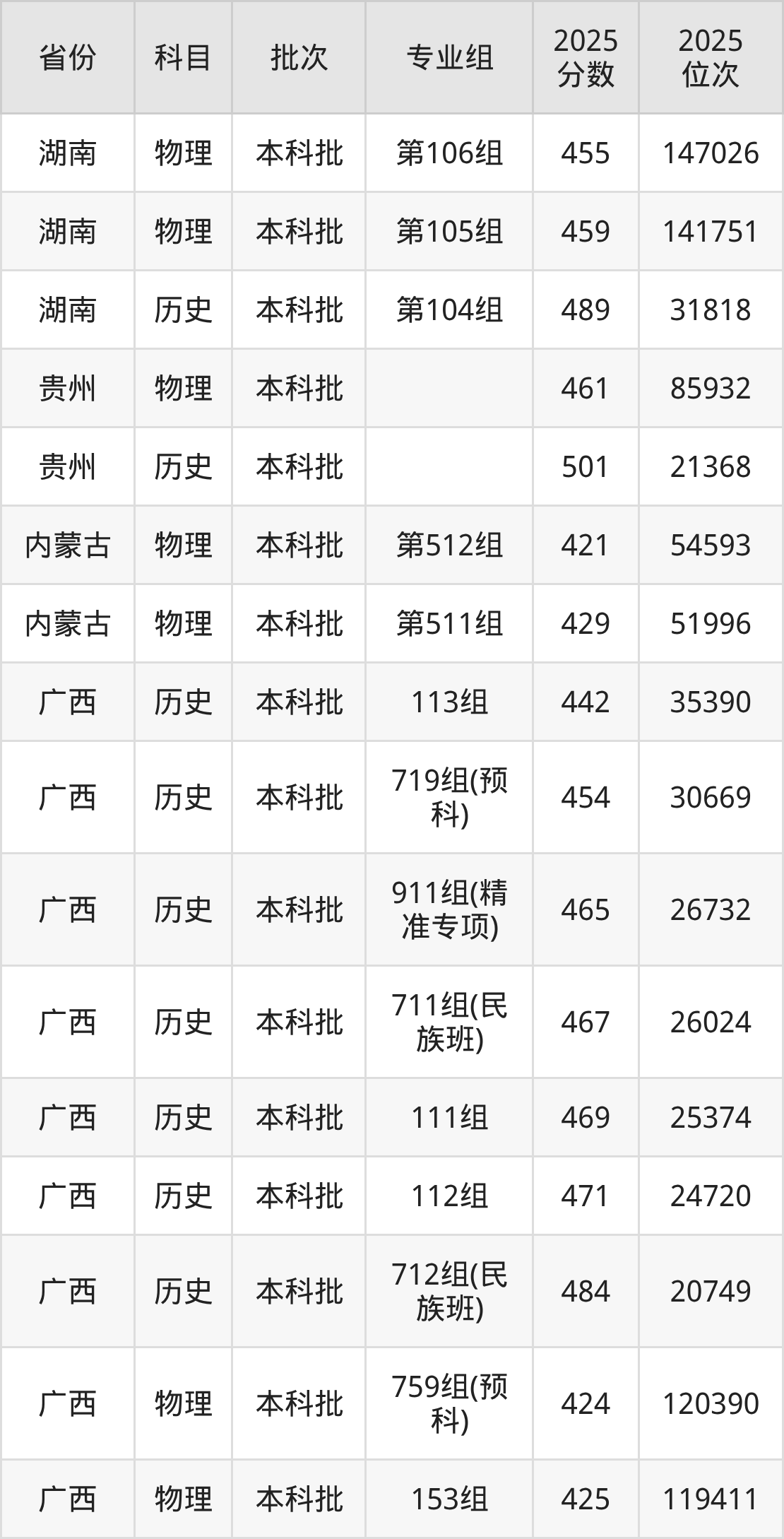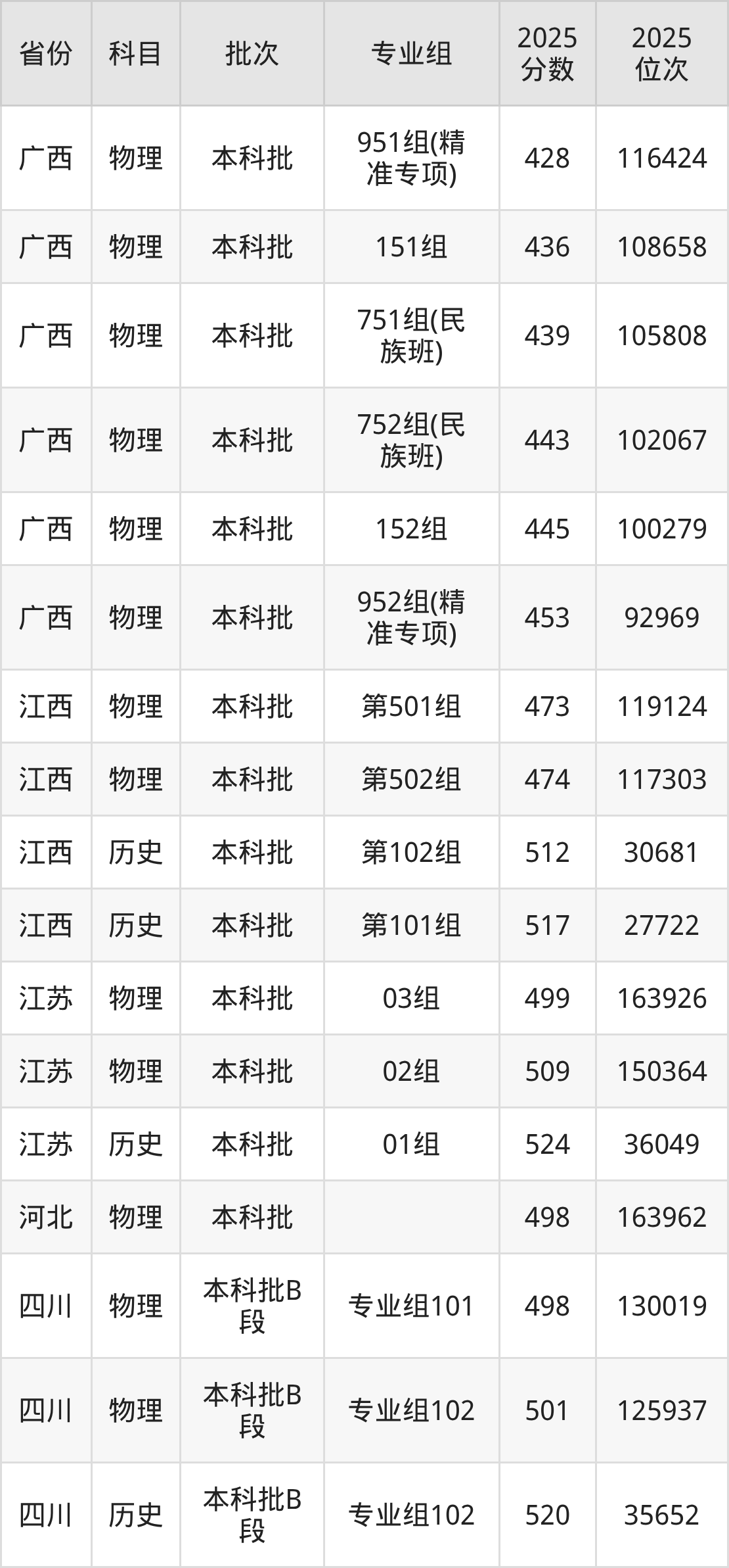 2025年在本科物理类进行招生,各专业组分数线详情如下: