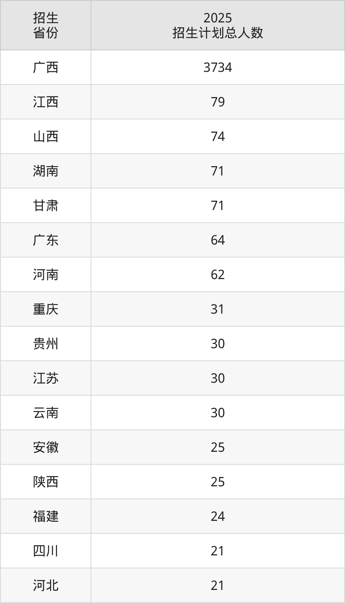 2025年贺州学院面向全国20个省市开展本科招生;招生专业共39个,招生人数共4460人。2025年在广西壮族自治区招生计划总人数是3734人,其中,贺州学院在广西壮族自治区招生人数最多的是思想政治教育。贺州学院在各省具体招生人数情况如下表。
