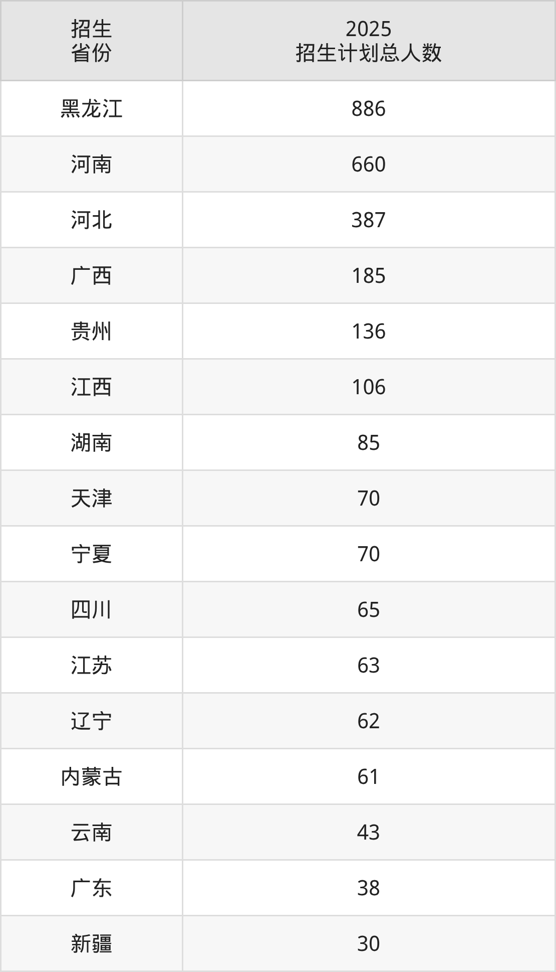 2025年哈尔滨华德学院面向全国22个省市开展本科招生;招生专业共26个,招生人数共3059人。2025年在黑龙江省招生计划总人数是886人,其中,哈尔滨华德学院在黑龙江省招生人数最多的是计算机科学与技术。哈尔滨华德学院在各省具体招生人数情况如下表。