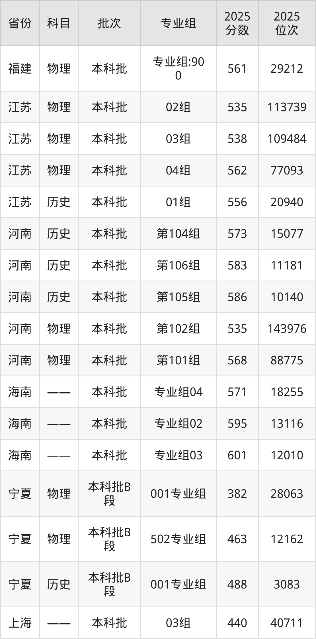 2025年湖南科技大学全国录取分数线是382分到601分,录取最低在宁夏物理类(001专业组)、录取最高在海南(专业组03)。各省各专业组最低分具有差异,详情如下: