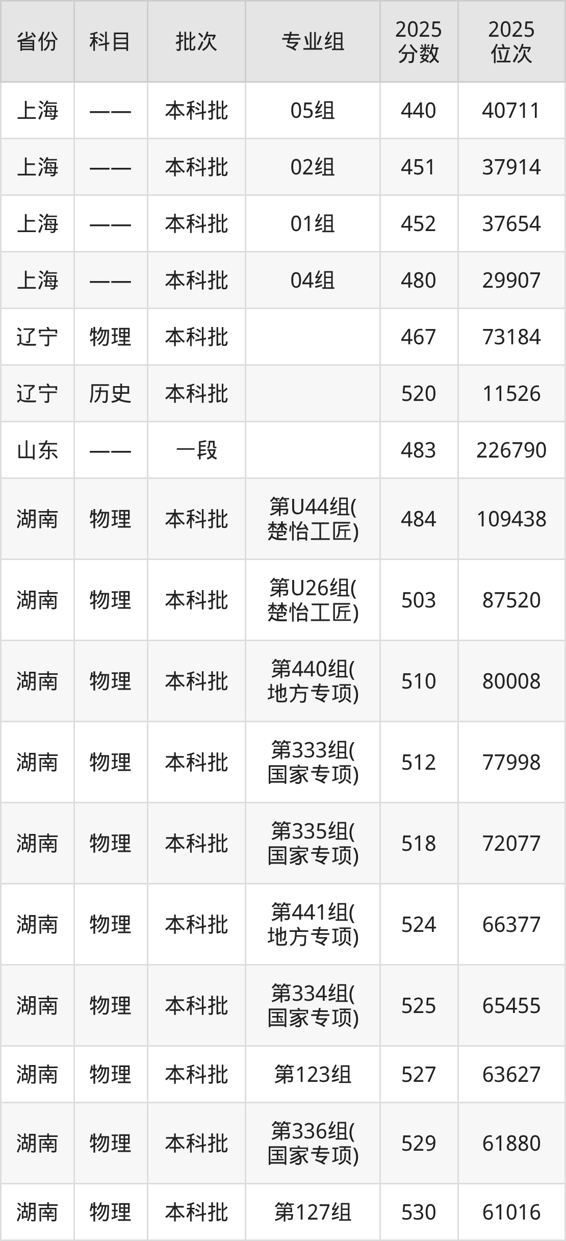 湖南科技大学第U44组(楚怡工匠):2025年投档录取最低分为484分,录取最低位次为109438名。