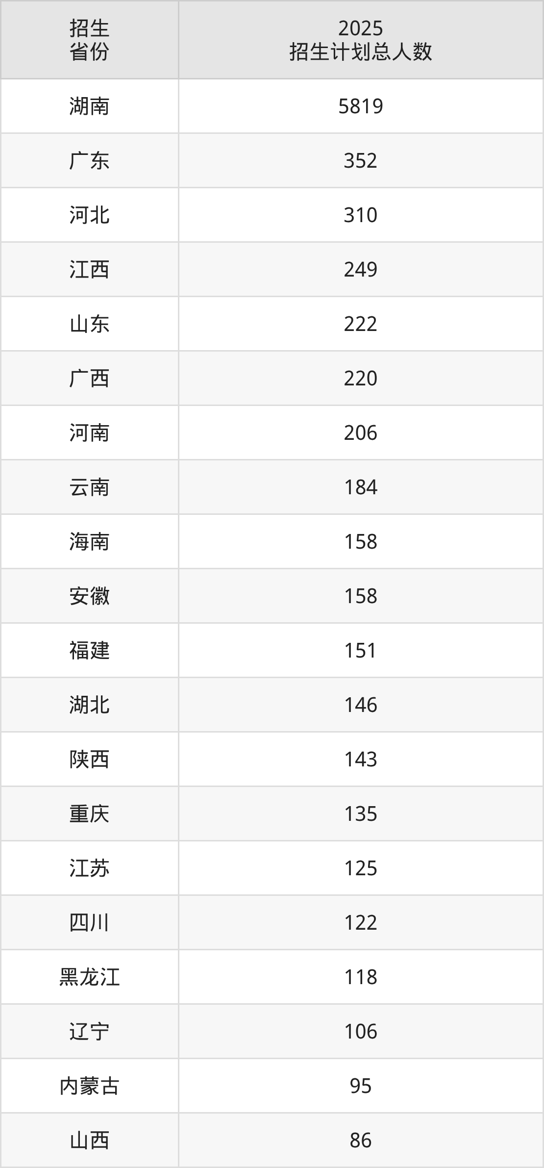 2025年湖南科技大学面向全国29个省市开展本科招生;招生专业共61个,招生人数共9588人。2025年在湖南省招生计划总人数是5819人,其中,湖南科技大学在湖南省招生人数最多的是电气工程及其自动化。湖南科技大学在各省具体招生人数情况如下表。