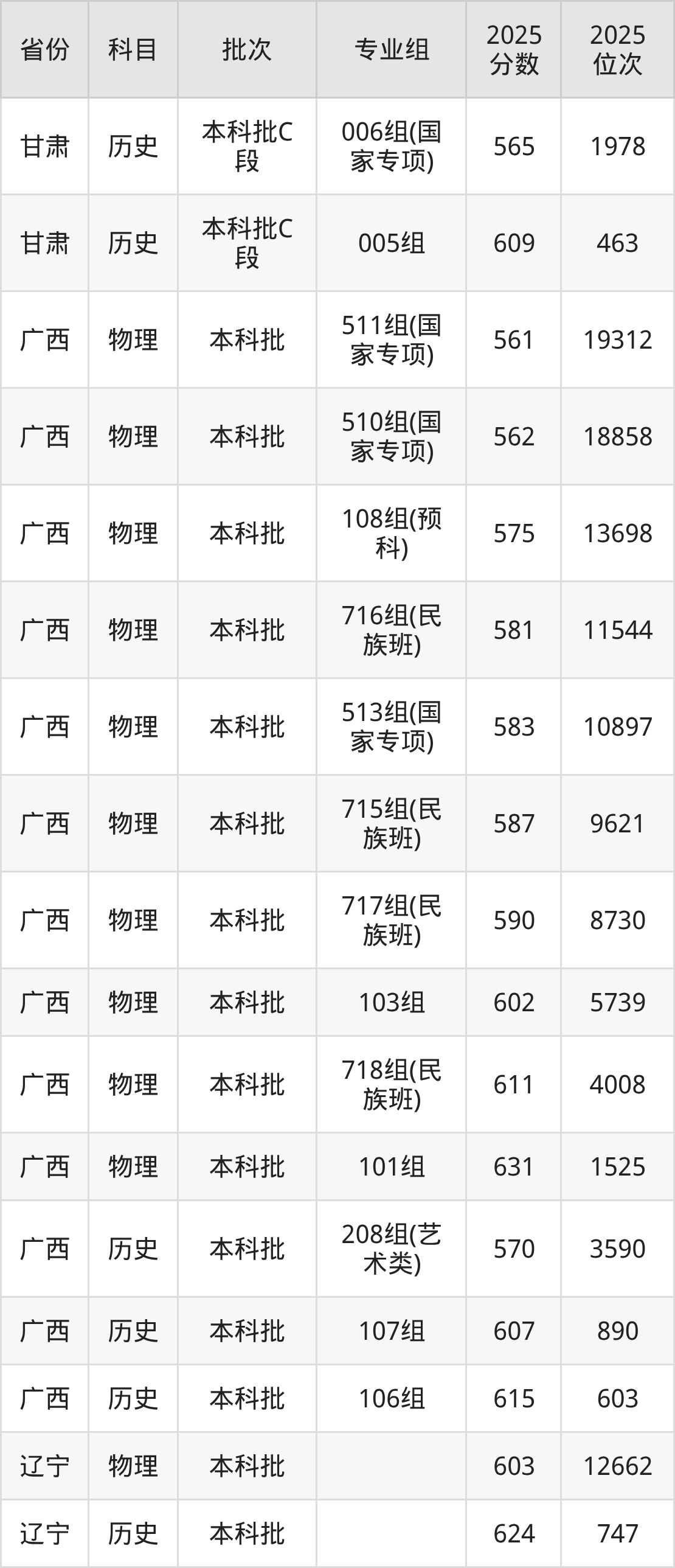 重庆大学716组(民族班):2025年投档录取最低分为581分,录取最低位次为11544名。