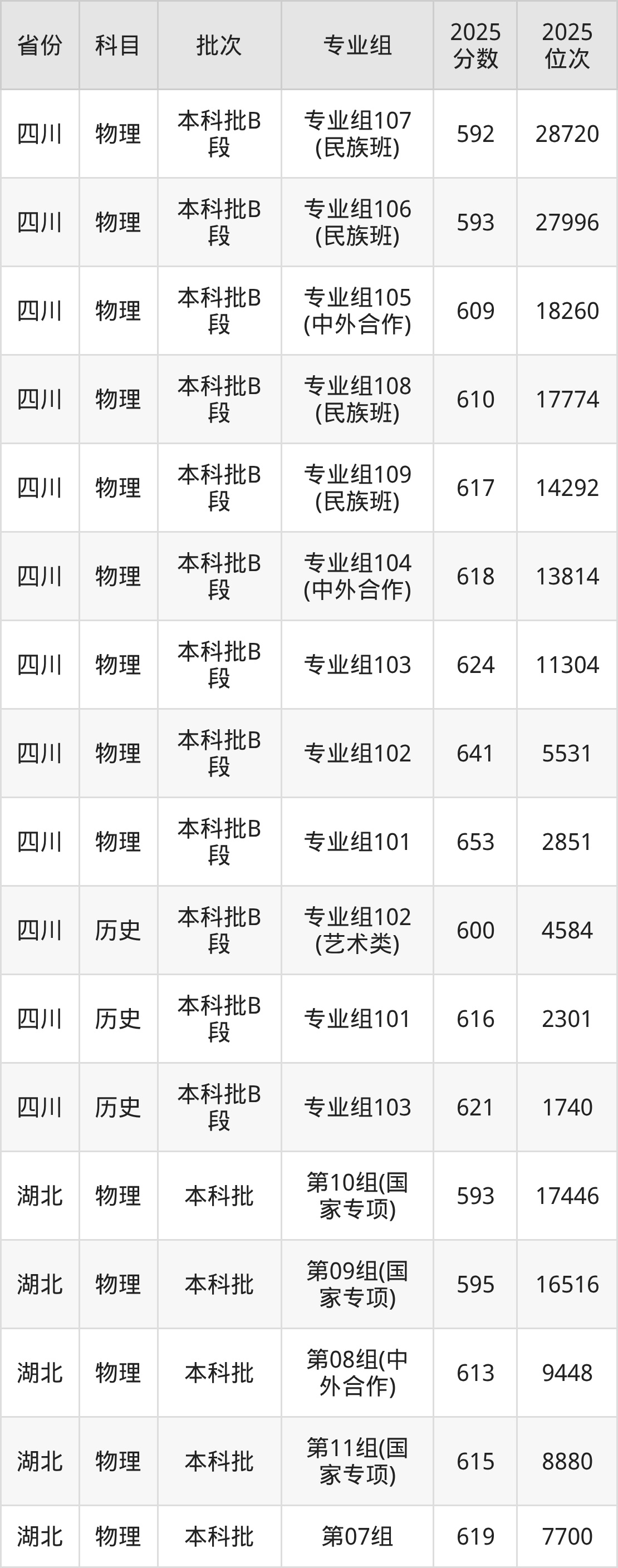 重庆大学718组(民族班):2025年投档录取最低分为611分,录取最低位次为4008名。