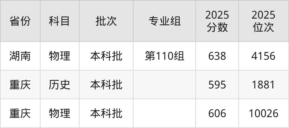 重庆大学第110组:2025年投档录取最低分为638分,录取最低位次为4156名。