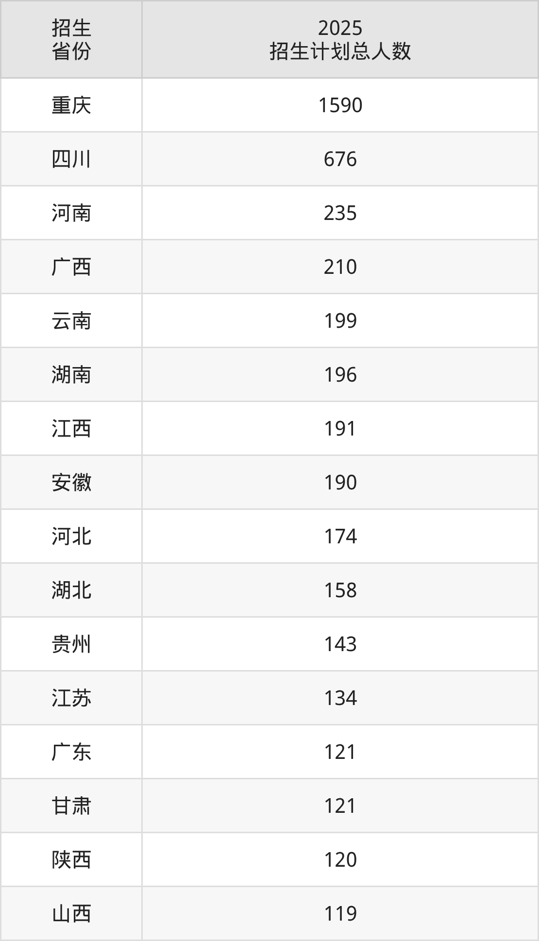 2025年重庆大学面向全国28个省市开展本科招生;招生专业共31个,招生人数共5169人。2025年在重庆市招生计划总人数是1590人,其中,重庆大学在重庆市招生人数最多的是工科试验班。重庆大学在各省具体招生人数情况如下表。
