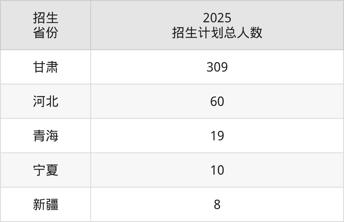 2025年定西职业技术学院面向全国5个省市开展专科招生;招生专业共16个,招生人数共406人。2025年在甘肃省招生计划总人数是309人,其中,定西职业技术学院在甘肃省招生人数最多的是中医康复技术。定西职业技术学院在各省具体招生人数情况如下表。