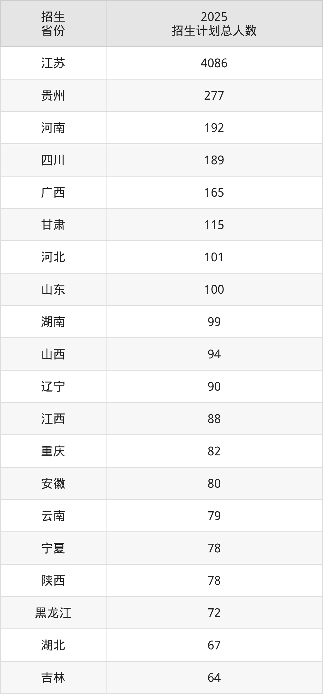 2025年江苏科技大学面向全国29个省市开展本科招生;招生专业共54个,招生人数共6446人。2025年在江苏省招生计划总人数是4086人,其中,江苏科技大学在江苏省招生人数最多的是电子信息类。江苏科技大学在各省具体招生人数情况如下表。