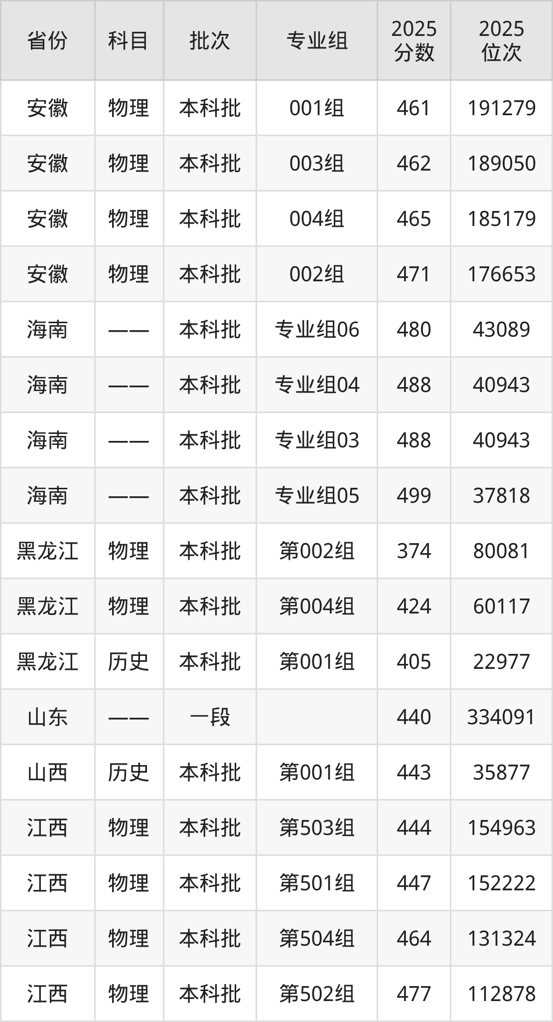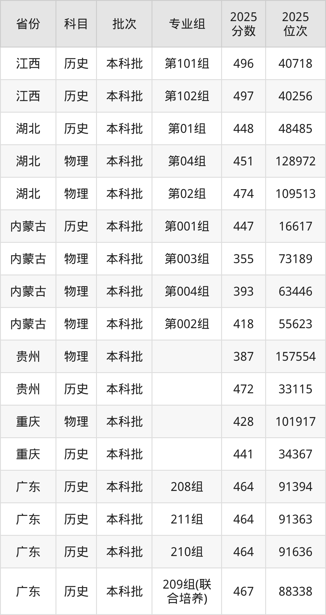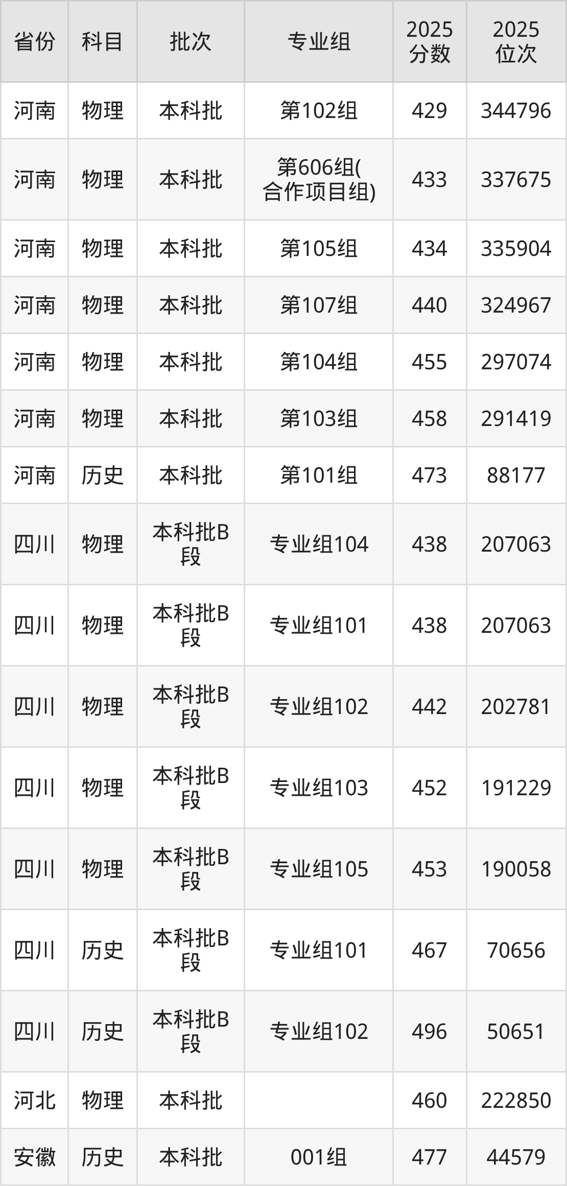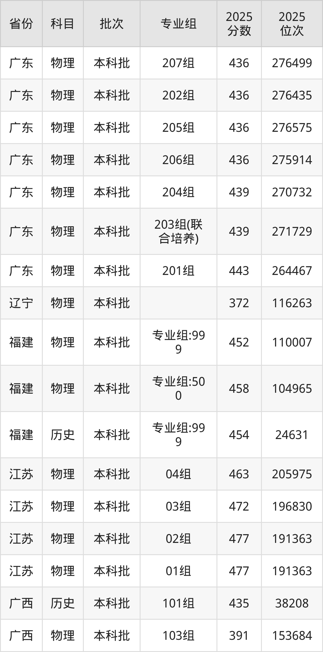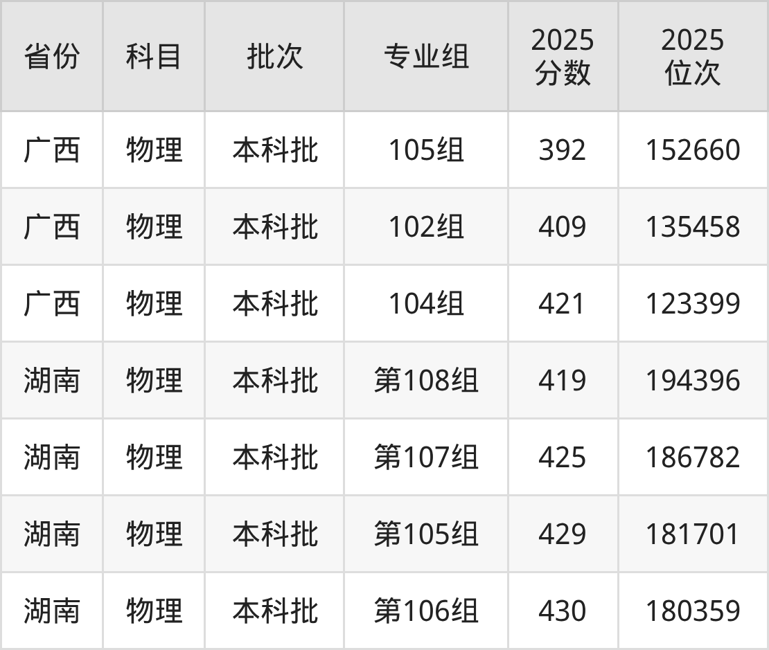2025年在本科物理类进行招生,各专业组分数线详情如下: