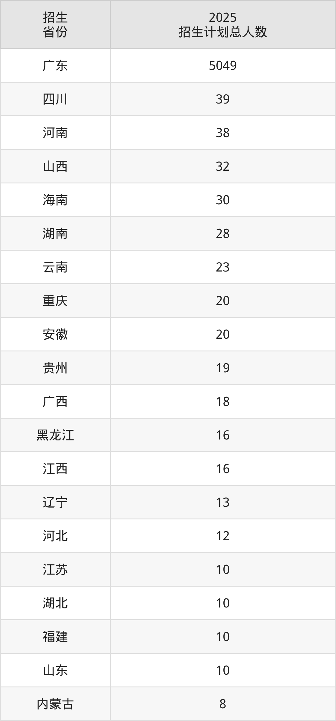 2025年广州华立学院面向全国20个省市开展本科招生;招生专业共41个,招生人数共5421人。2025年在广东省招生计划总人数是5049人,其中,广州华立学院在广东省招生人数最多的是计算机科学与技术。广州华立学院在各省具体招生人数情况如下表。