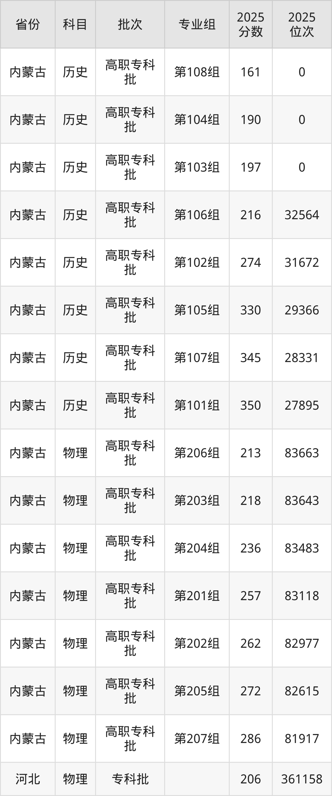 内蒙古北方职业技术学院第108组:2025年投档录取最低分为161分,录取最低位次为0名。