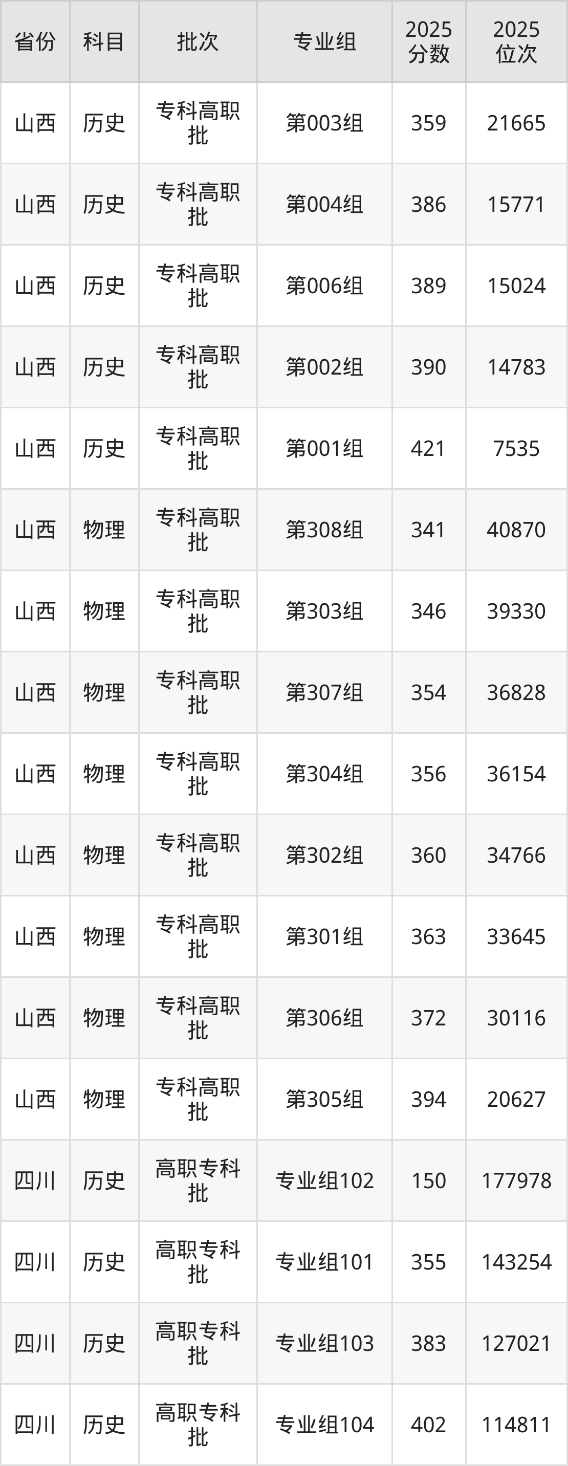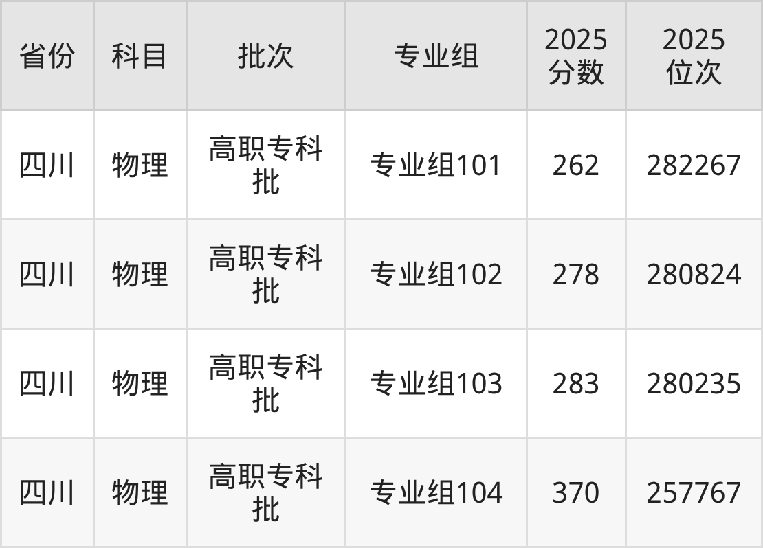 2025年在专科物理类进行招生,各专业组分数线详情如下: