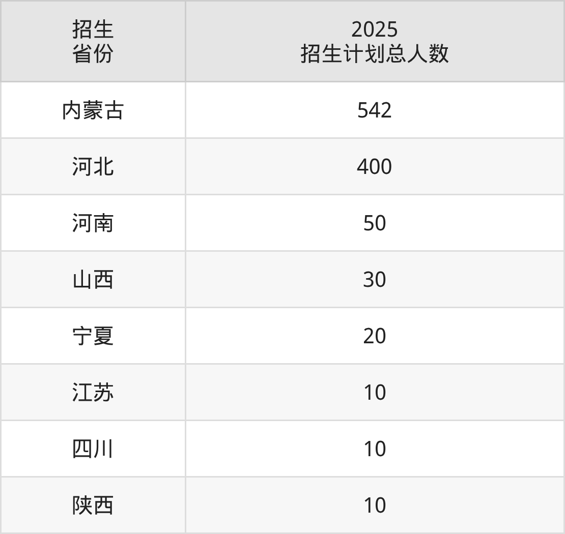 2025年内蒙古北方职业技术学院面向全国8个省市开展专科招生;招生专业共18个,招生人数共1072人。2025年在内蒙古自治区招生计划总人数是542人,其中,内蒙古北方职业技术学院在内蒙古自治区招生人数最多的是中医学。内蒙古北方职业技术学院在各省具体招生人数情况如下表。
