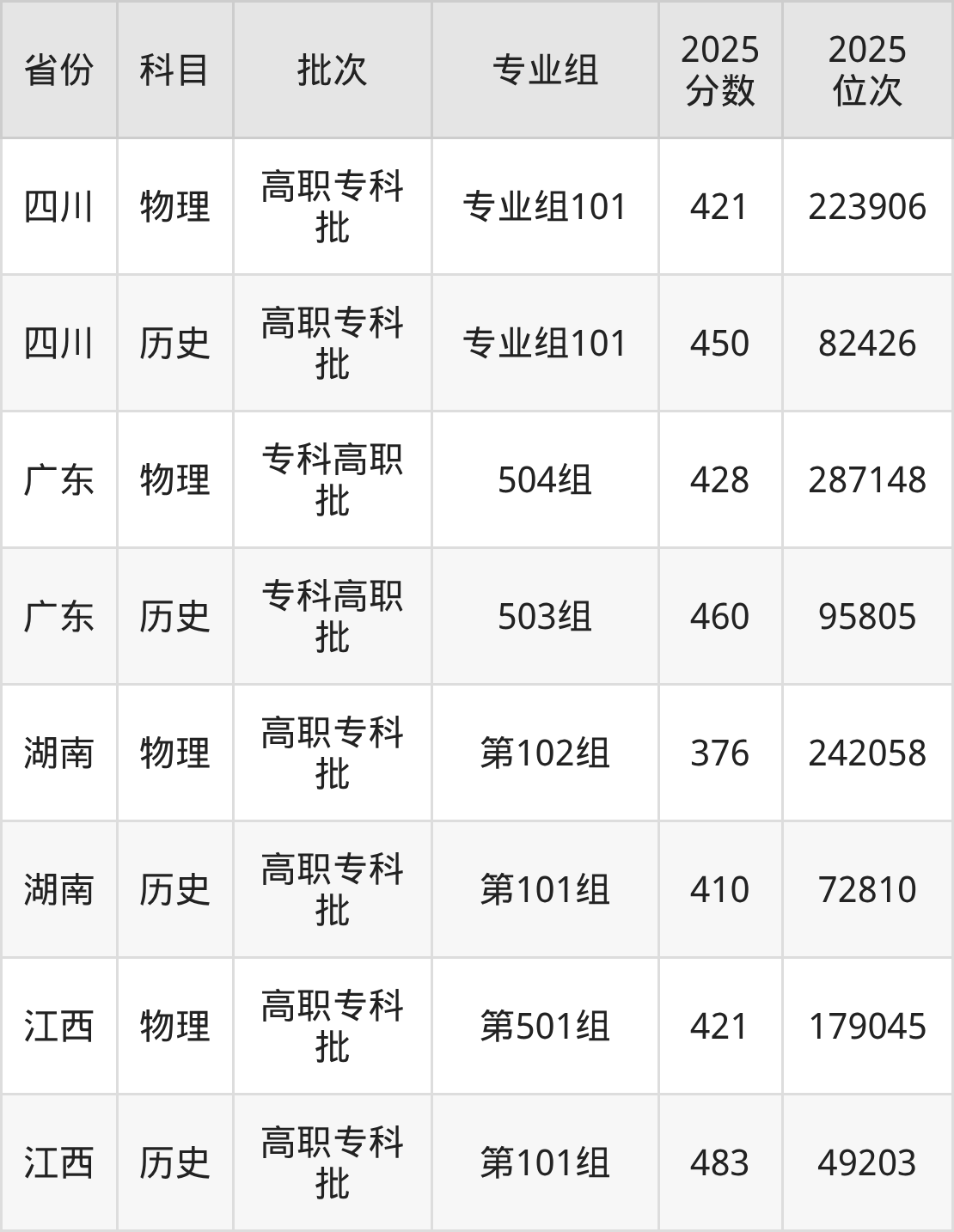 普通类专科物理类最低421分,专科历史类最低450分