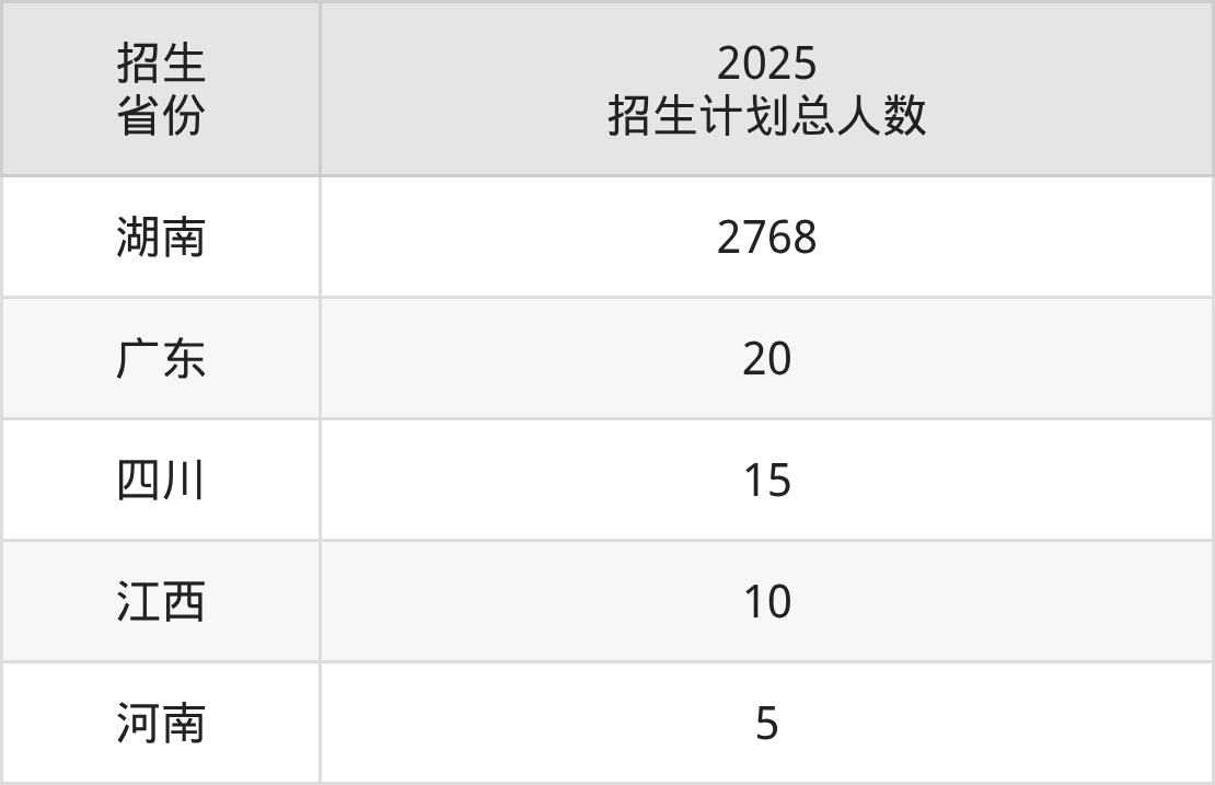 2025年湖南中医药高等专科学校面向全国5个省市开展专科招生;招生专业共20个,招生人数共2818人。2025年在湖南省招生计划总人数是2768人,其中,湖南中医药高等专科学校在湖南省招生人数最多的是护理。湖南中医药高等专科学校在各省具体招生人数情况如下表。
