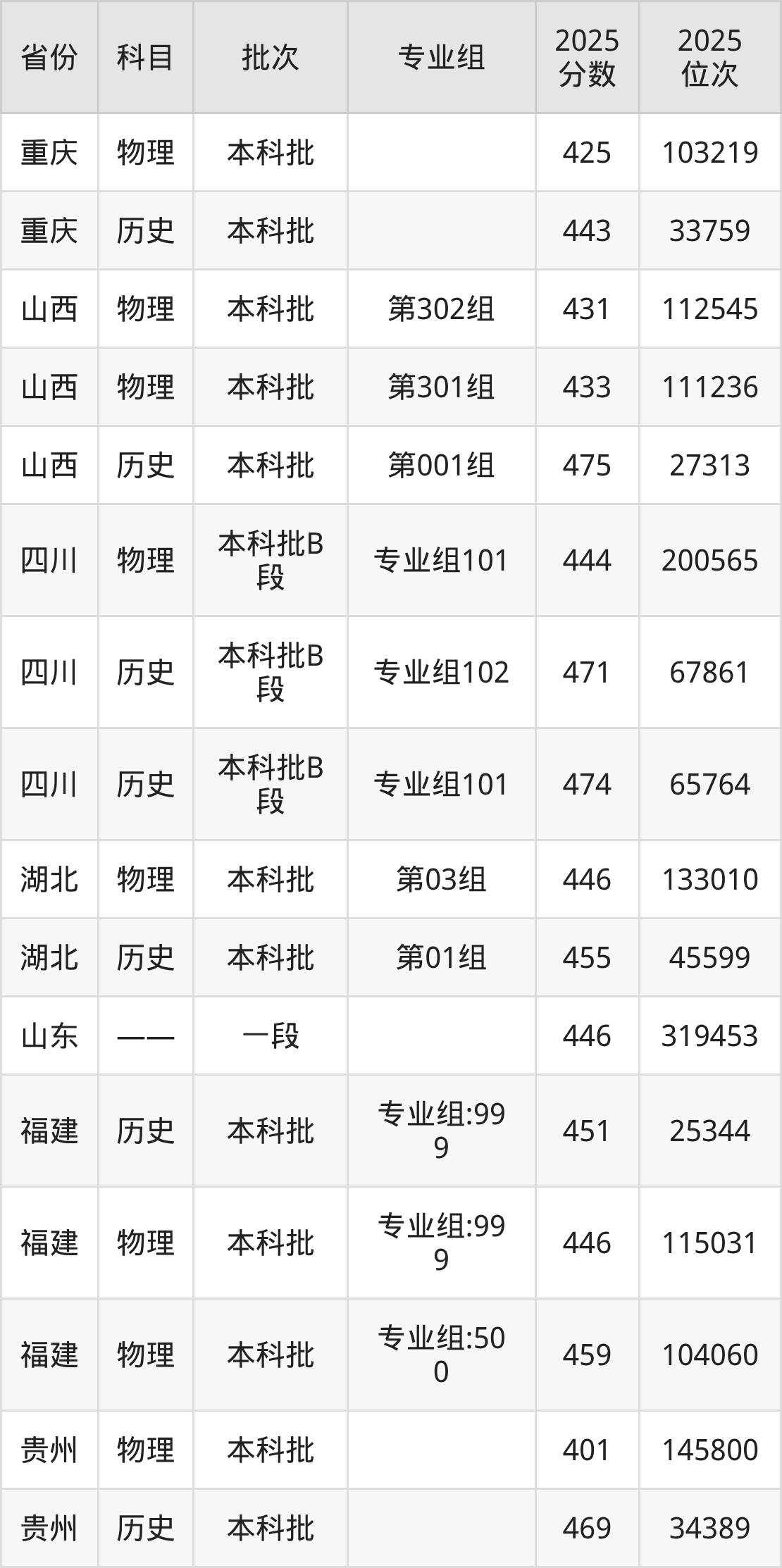 2025年投档录取最低分为425分,录取最低位次为103219名。