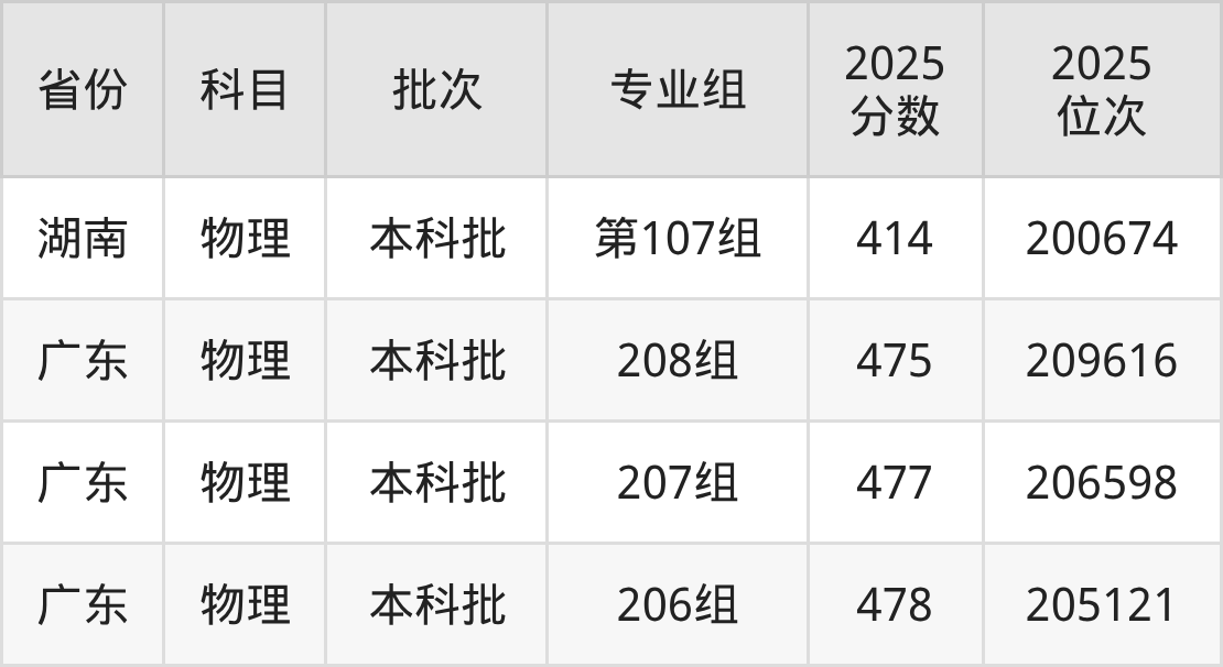 2025年在本科物理类进行招生,各专业组分数线详情如下: