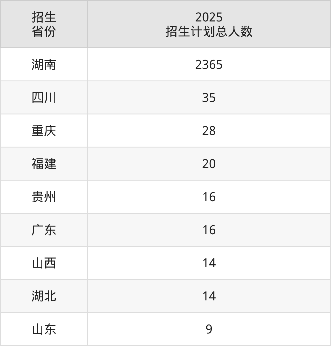 2025年湖南交通工程学院面向全国9个省市开展本科招生;招生专业共26个,招生人数共2517人。2025年在湖南省招生计划总人数是2365人,其中,湖南交通工程学院在湖南省招生人数最多的是机械设计制造及其自动化。湖南交通工程学院在各省具体招生人数情况如下表。