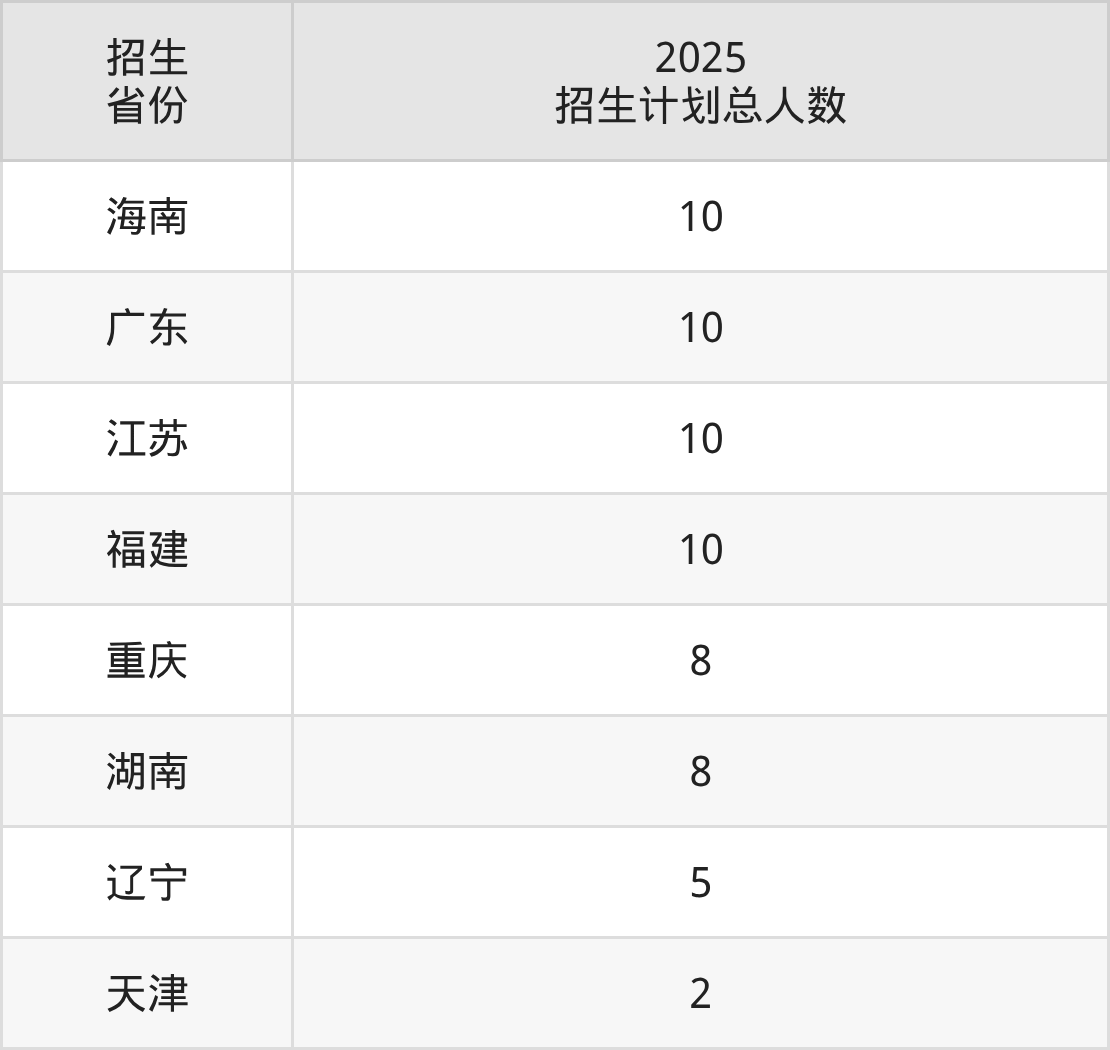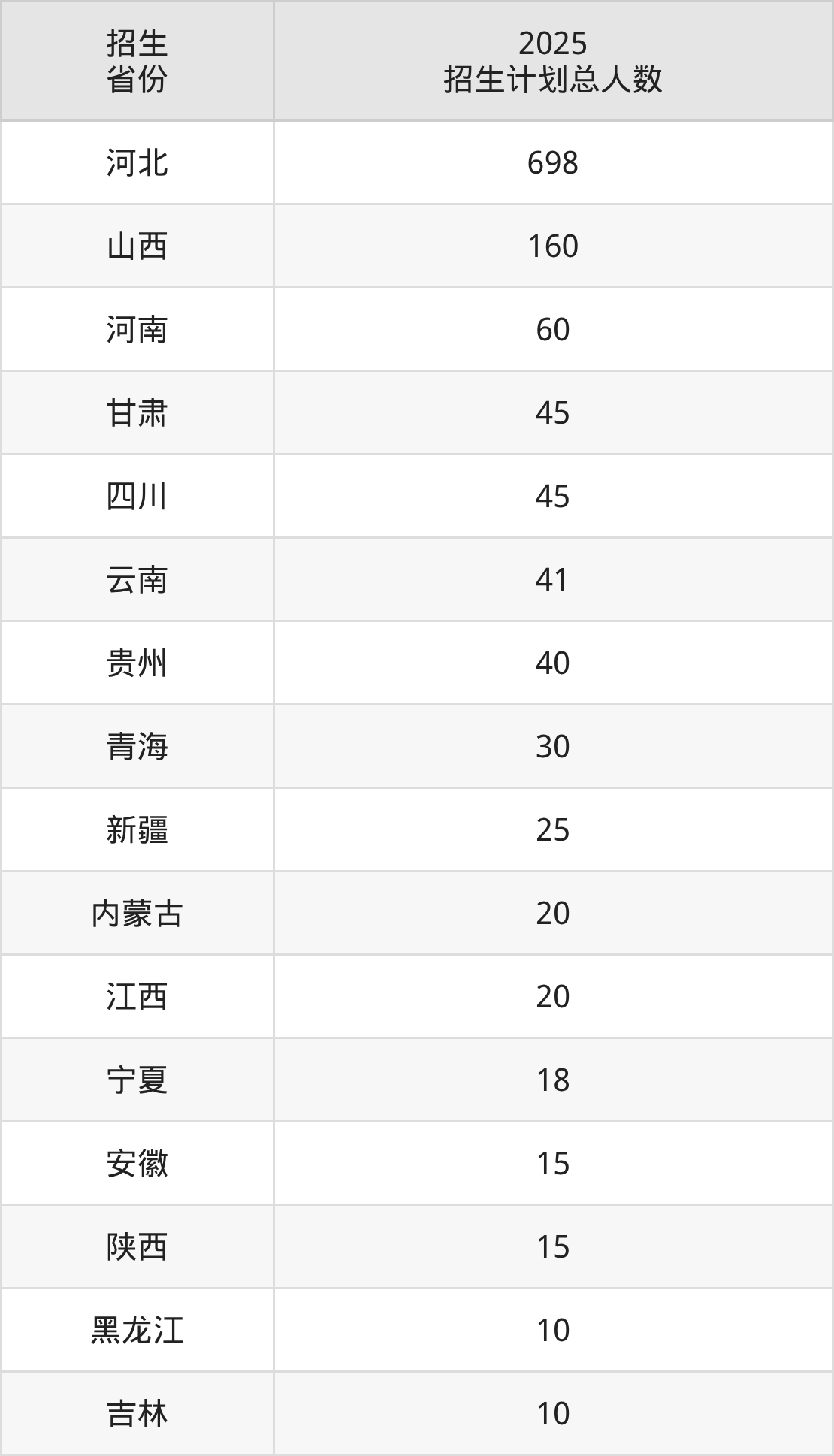 2025年石家庄铁路职业技术学院面向全国24个省市开展专科招生;招生专业共28个,招生人数共1315人。2025年在河北省招生计划总人数是698人,其中,石家庄铁路职业技术学院在河北省招生人数最多的是铁道信号自动控制。石家庄铁路职业技术学院在各省具体招生人数情况如下表。