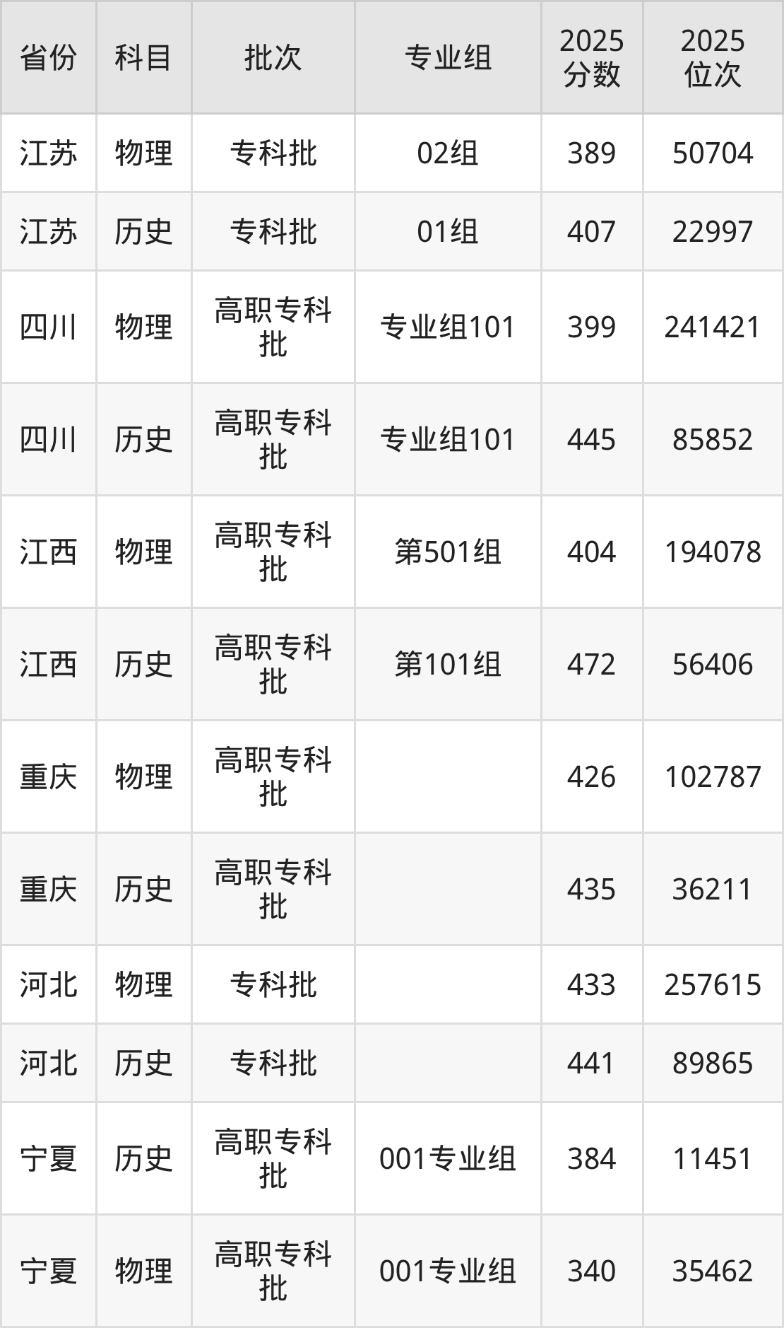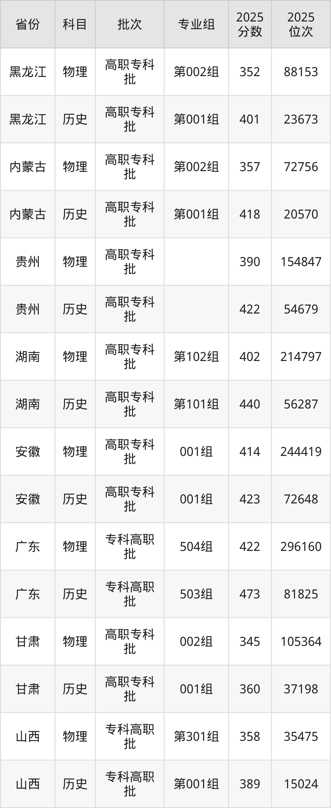 普通类专科物理类最低352分,专科历史类最低401分