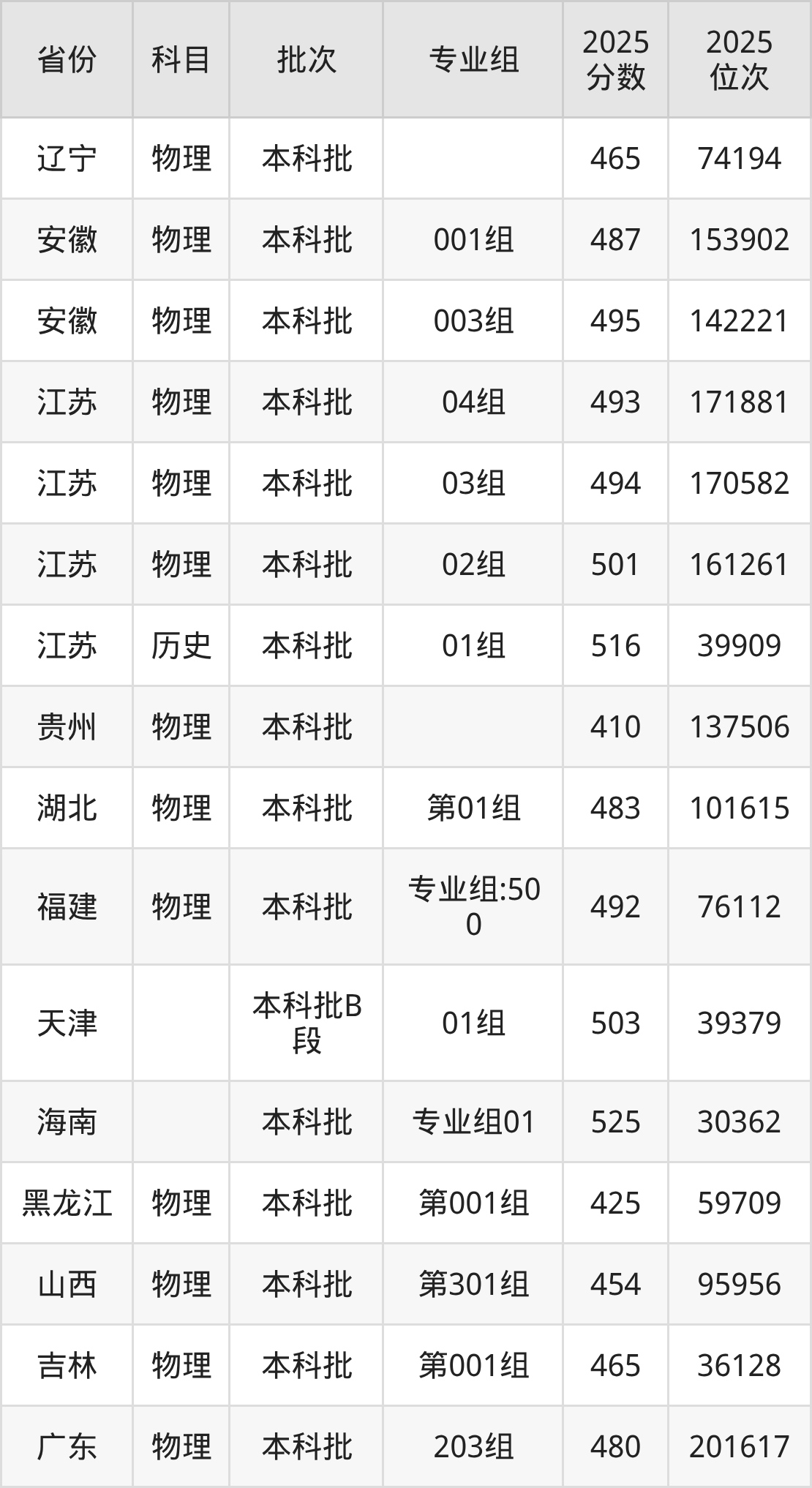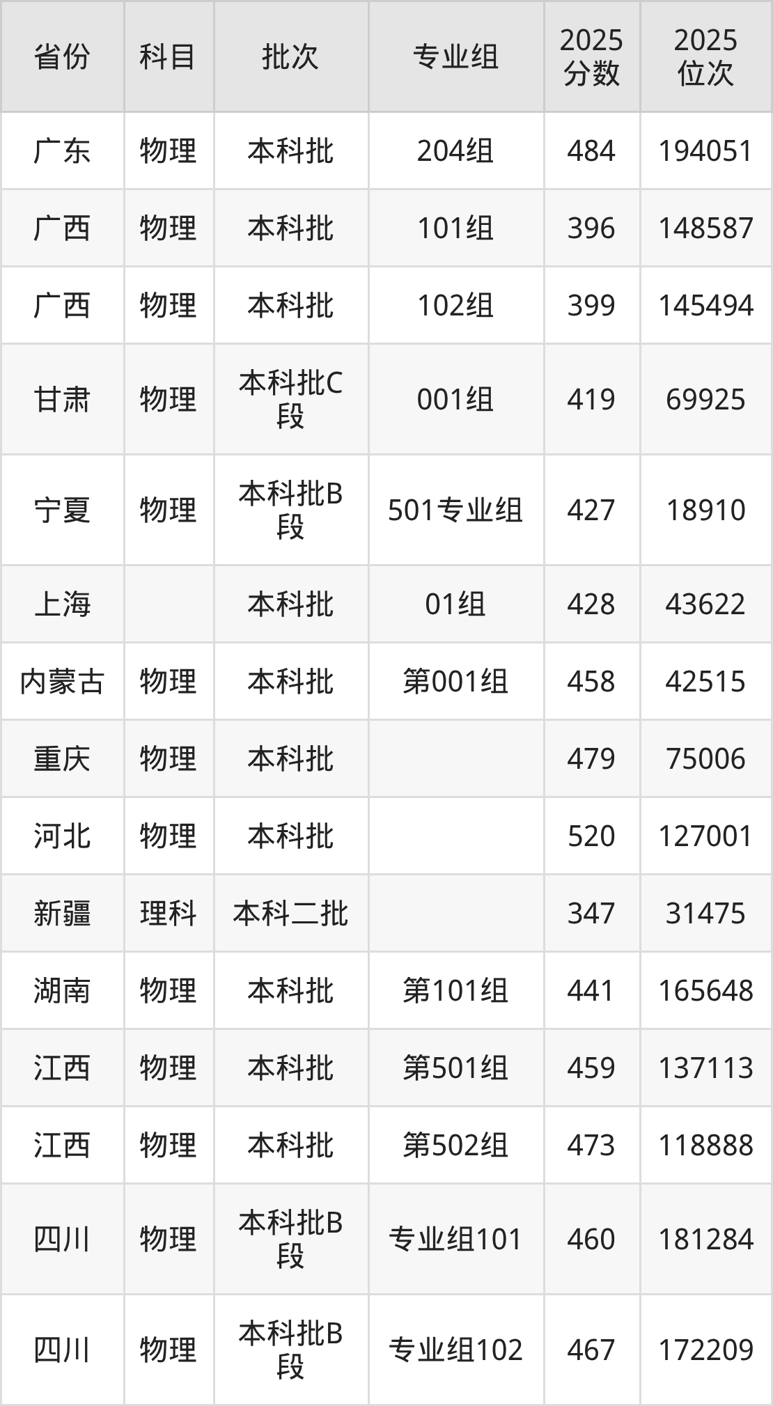2025年在本科物理类进行招生,各专业组分数线详情如下: