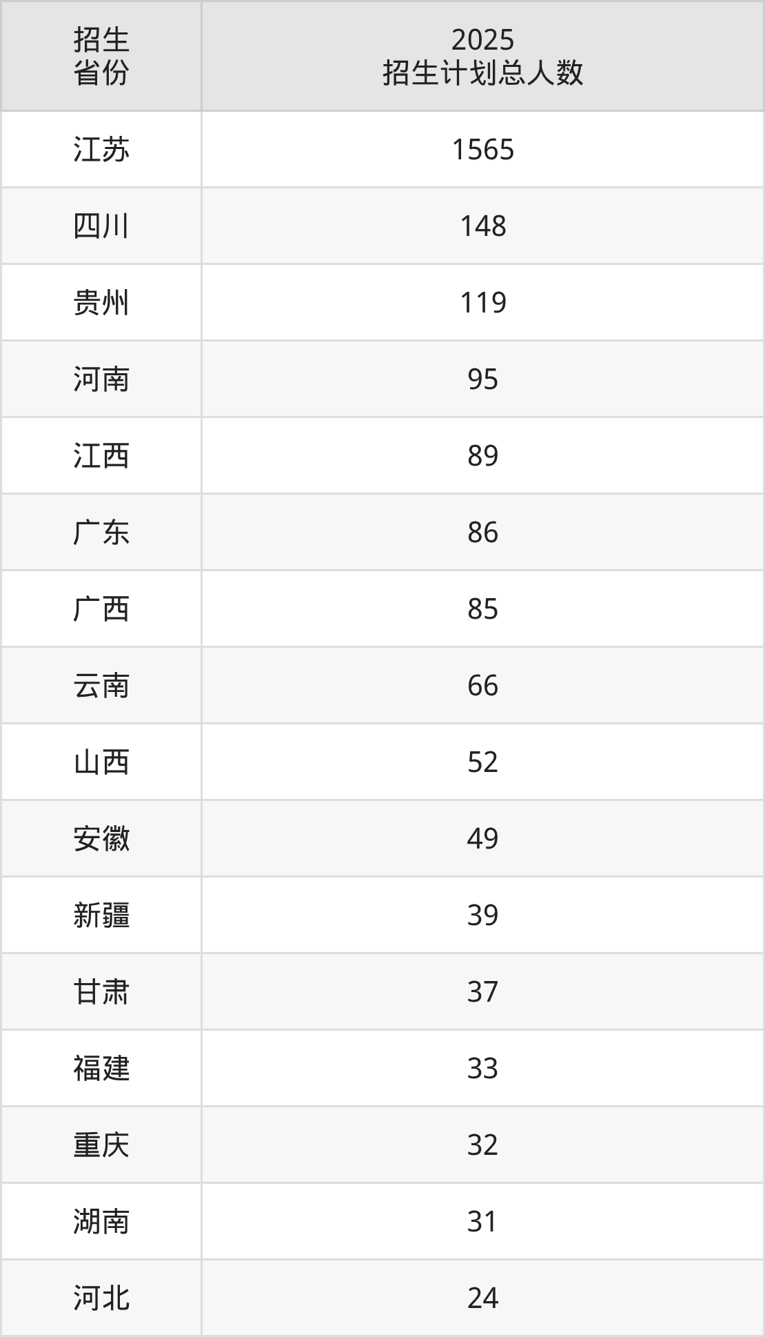 2025年南京邮电大学通达学院面向全国27个省市开展本科招生;招生专业共18个,招生人数共2667人。2025年在江苏省招生计划总人数是1565人,其中,南京邮电大学通达学院在江苏省招生人数最多的是电气工程及其自动化。南京邮电大学通达学院在各省具体招生人数情况如下表。