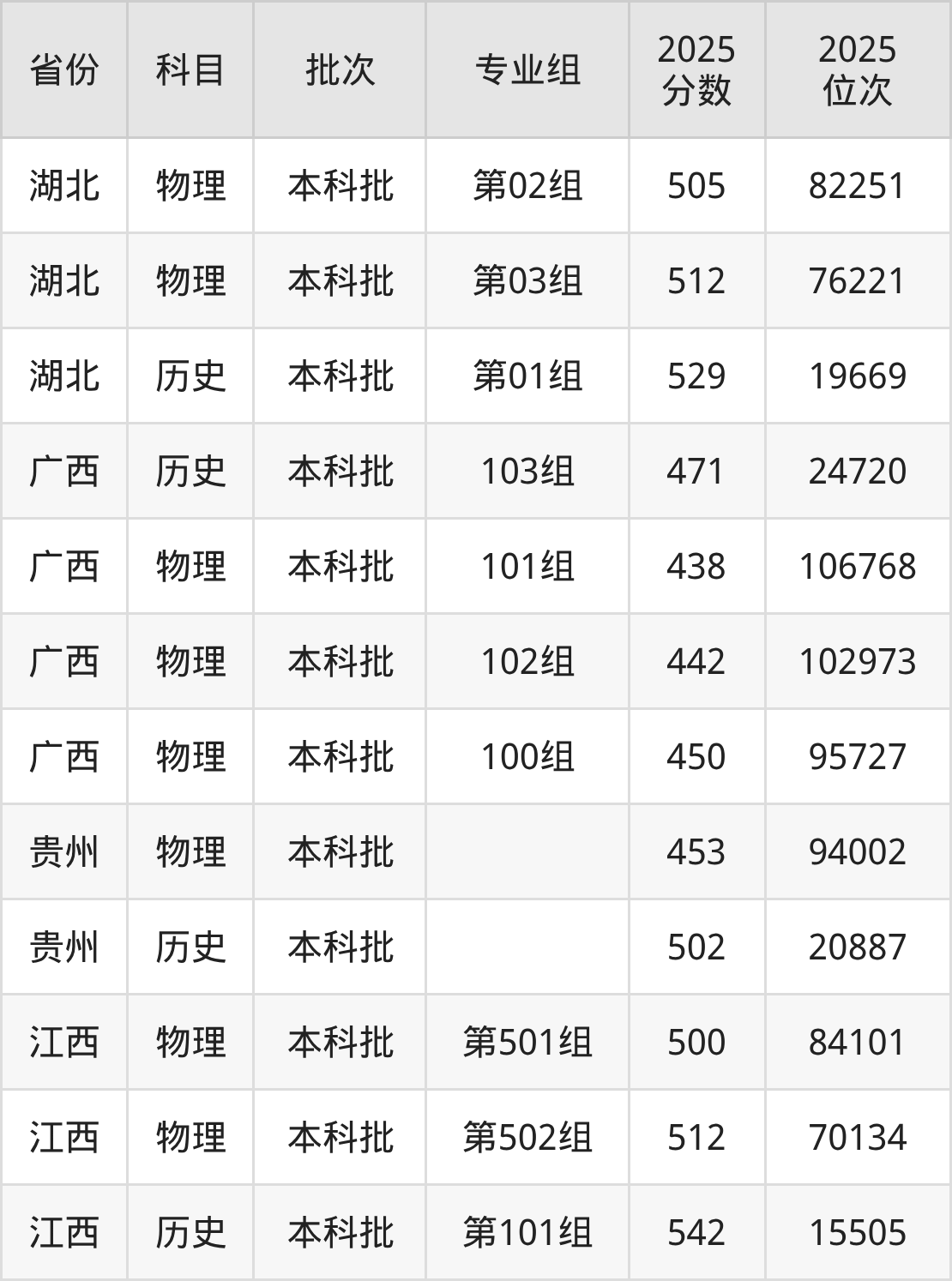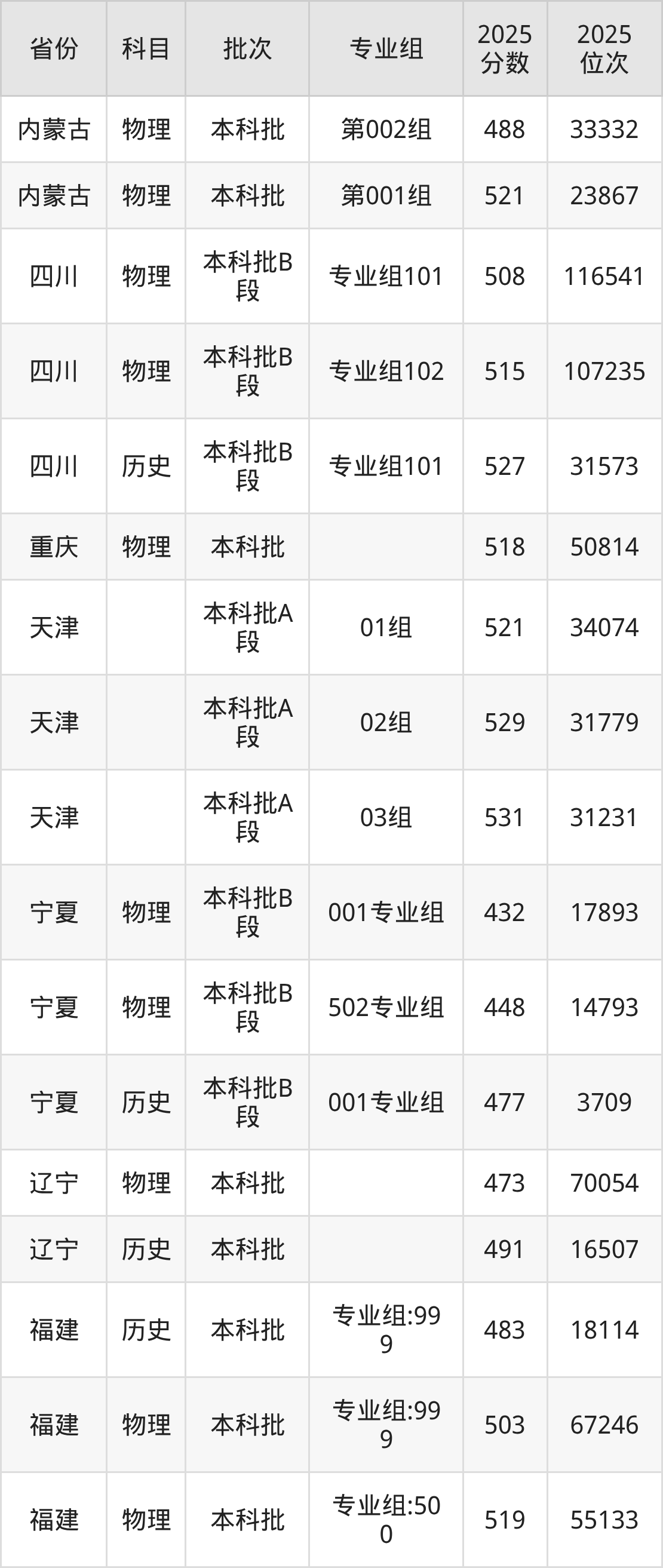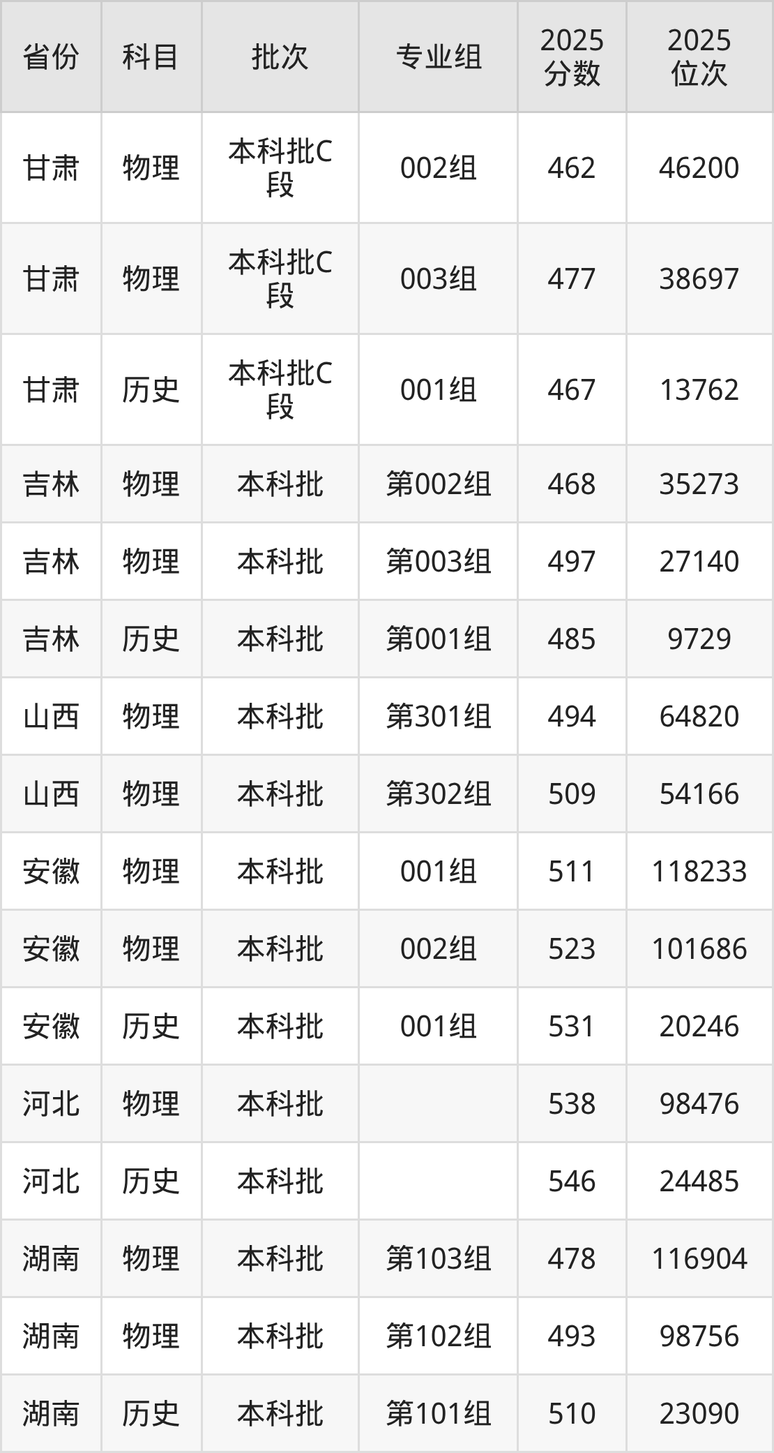 2025年在本科物理类进行招生,各专业组分数线详情如下: