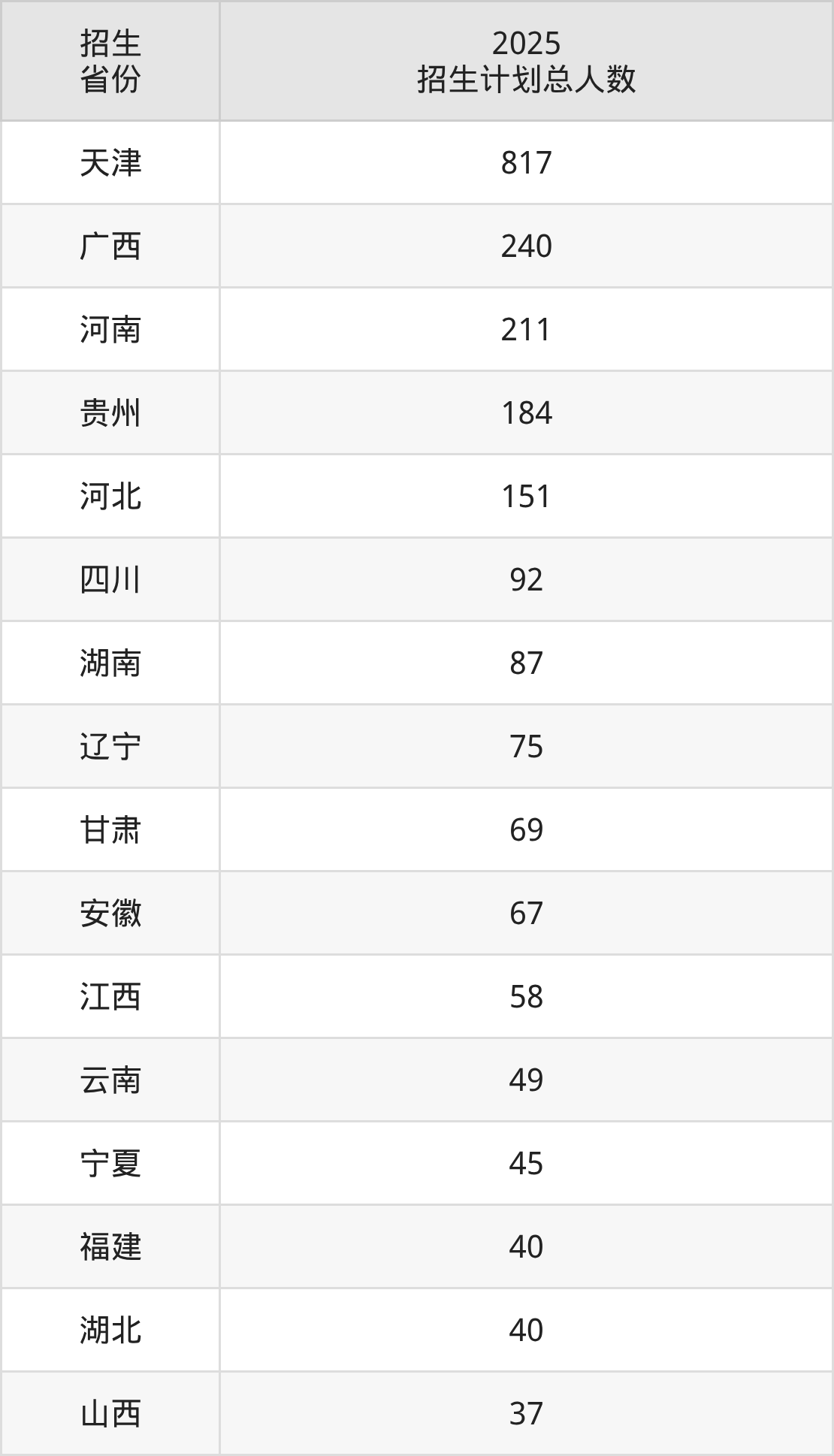 2025年天津中德应用技术大学面向全国19个省市开展本科招生;招生专业共21个,招生人数共1845人。2025年在天津市招生计划总人数是817人,其中,天津中德应用技术大学在天津市招生人数最多的是机电一体化技术。天津中德应用技术大学在各省具体招生人数情况如下表。