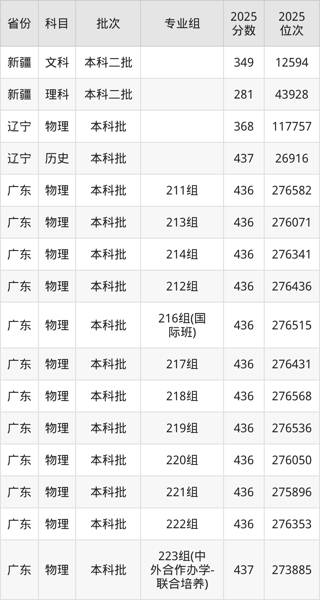 2025年广州工商学院全国录取分数线是281分到493分,录取最低在新疆理科、录取最高在海南(专业组01)。各省各专业组最低分具有差异,详情如下: