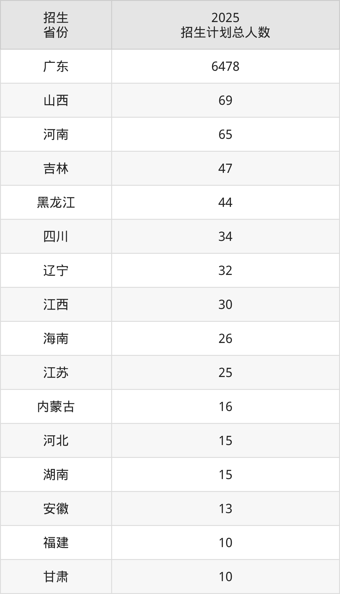 2025年广州工商学院面向全国19个省市开展本科招生;招生专业共26个,招生人数共6756人。2025年在广东省招生计划总人数是6478人,其中,广州工商学院在广东省招生人数最多的是软件工程。广州工商学院在各省具体招生人数情况如下表。