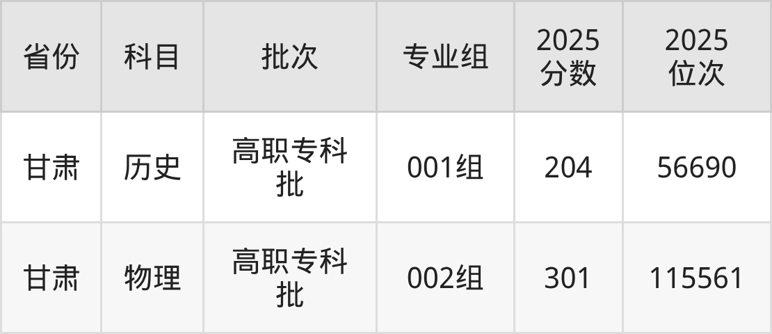 2025年西宁城市职业技术学院全国录取分数线是204分到301分,录取最低在甘肃历史类(001组)、录取最高在甘肃物理类(002组)。
