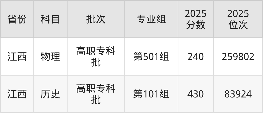 2025年广西职业技术学院全国录取分数线是240分到430分,录取最低在江西物理类(第501组)、录取最高在江西历史类(第101组)。