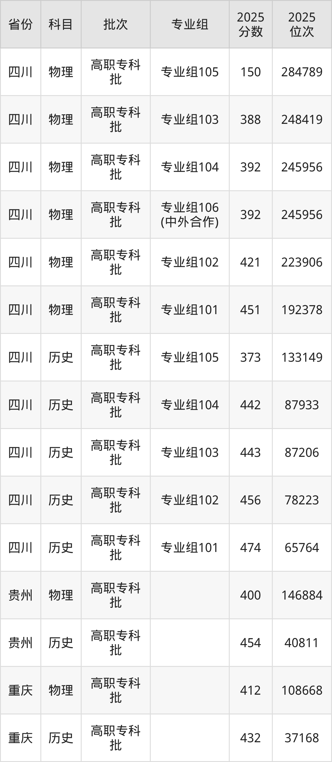 成都工业职业技术学院专业组105:2025年投档录取最低分为150分,录取最低位次为284789名。