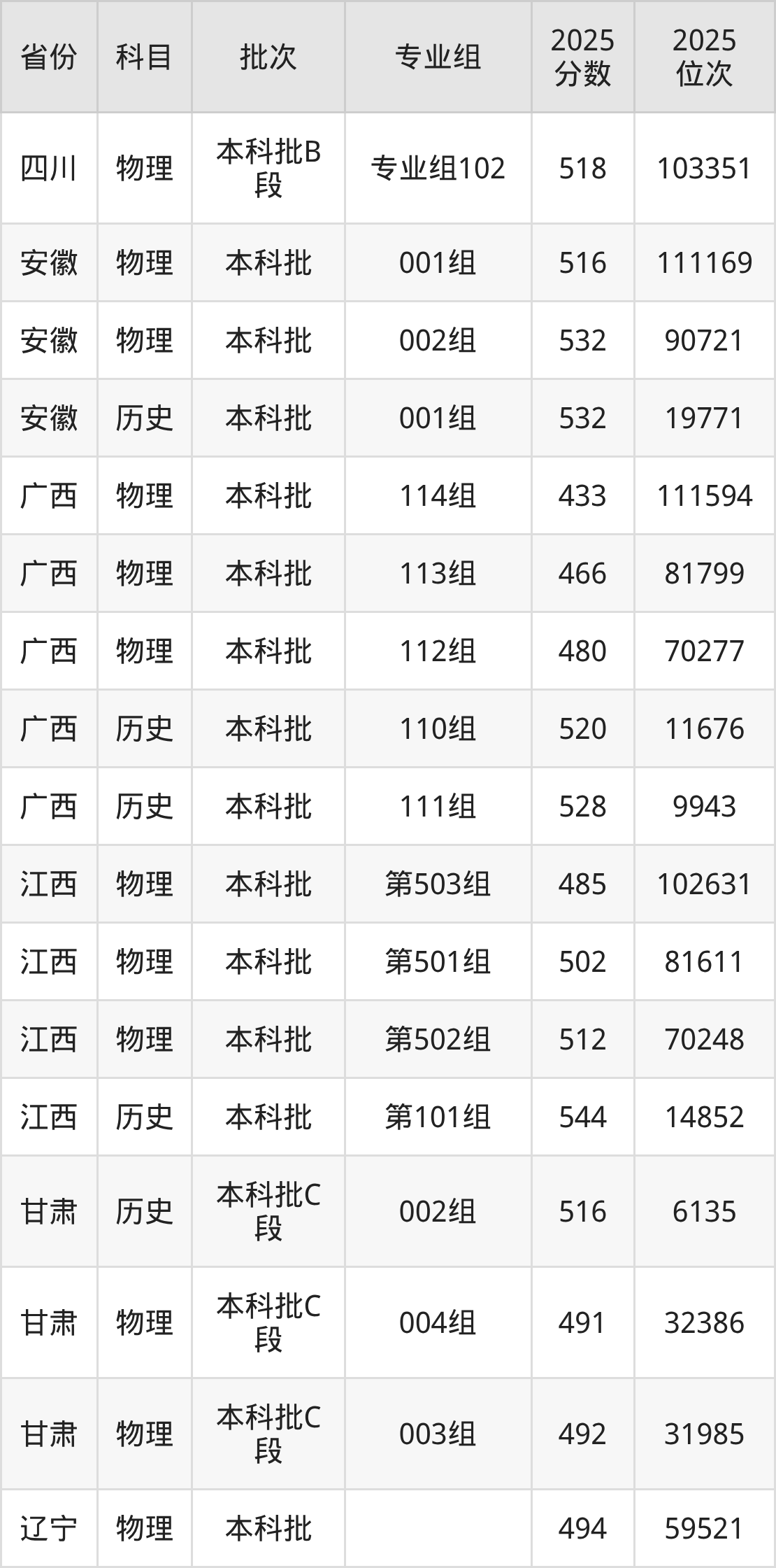 2025年投档录取最低分为494分,录取最低位次为59521名。