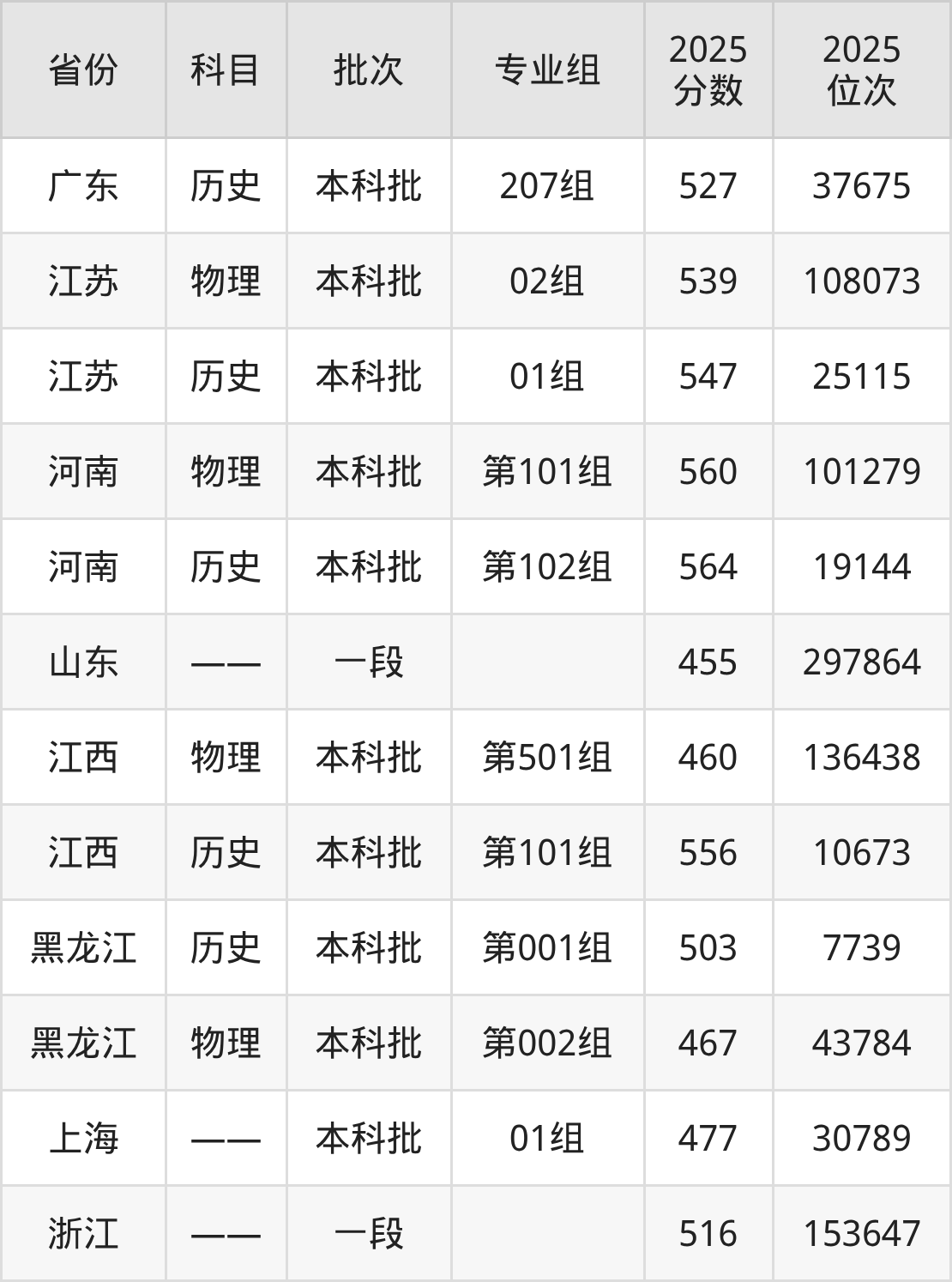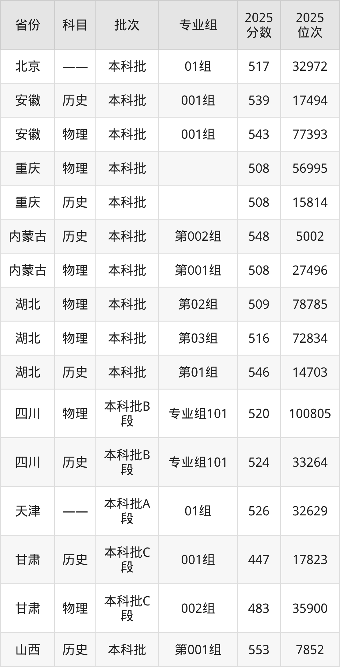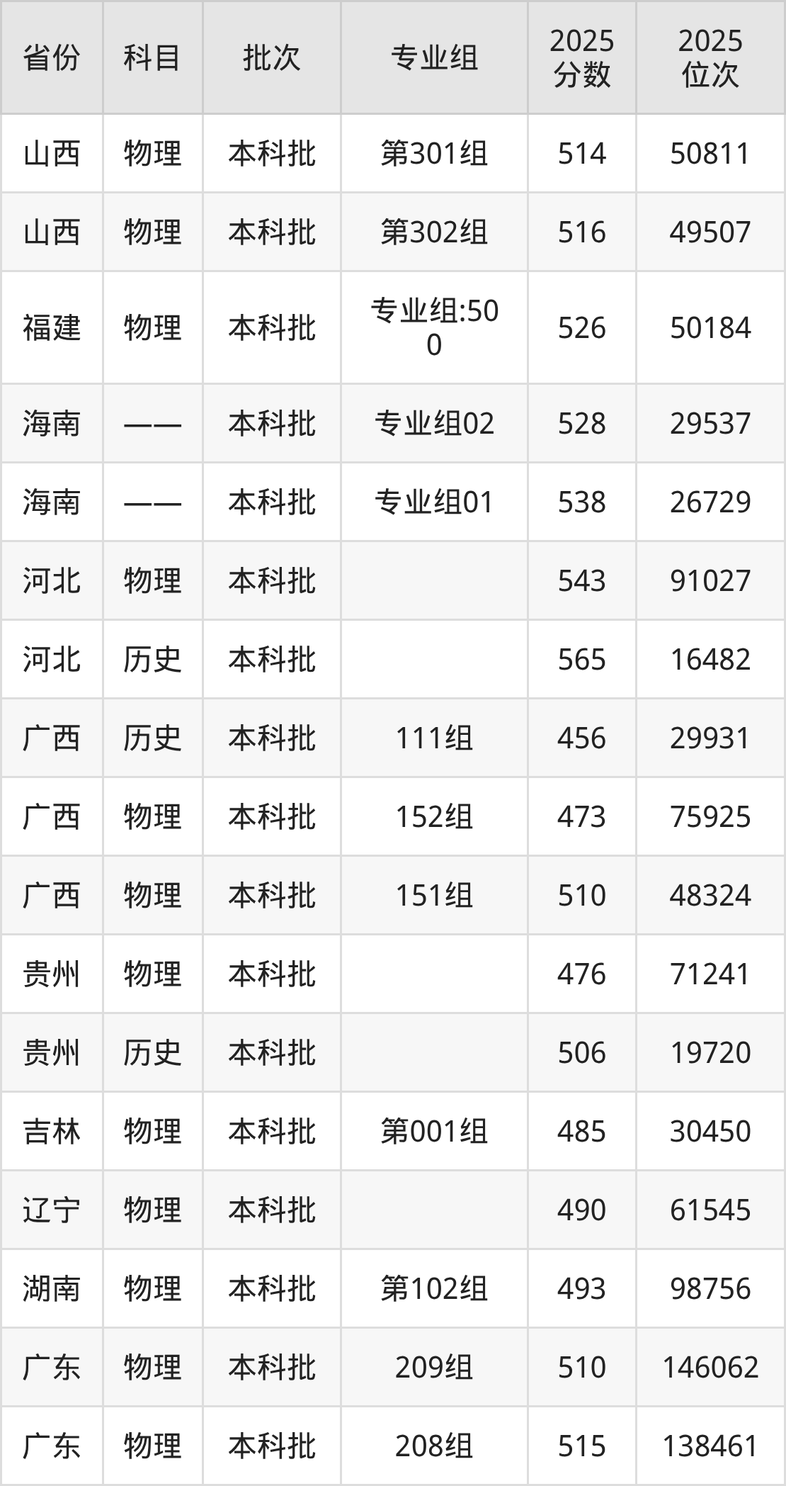 2025年在本科物理类进行招生,各专业组分数线详情如下: