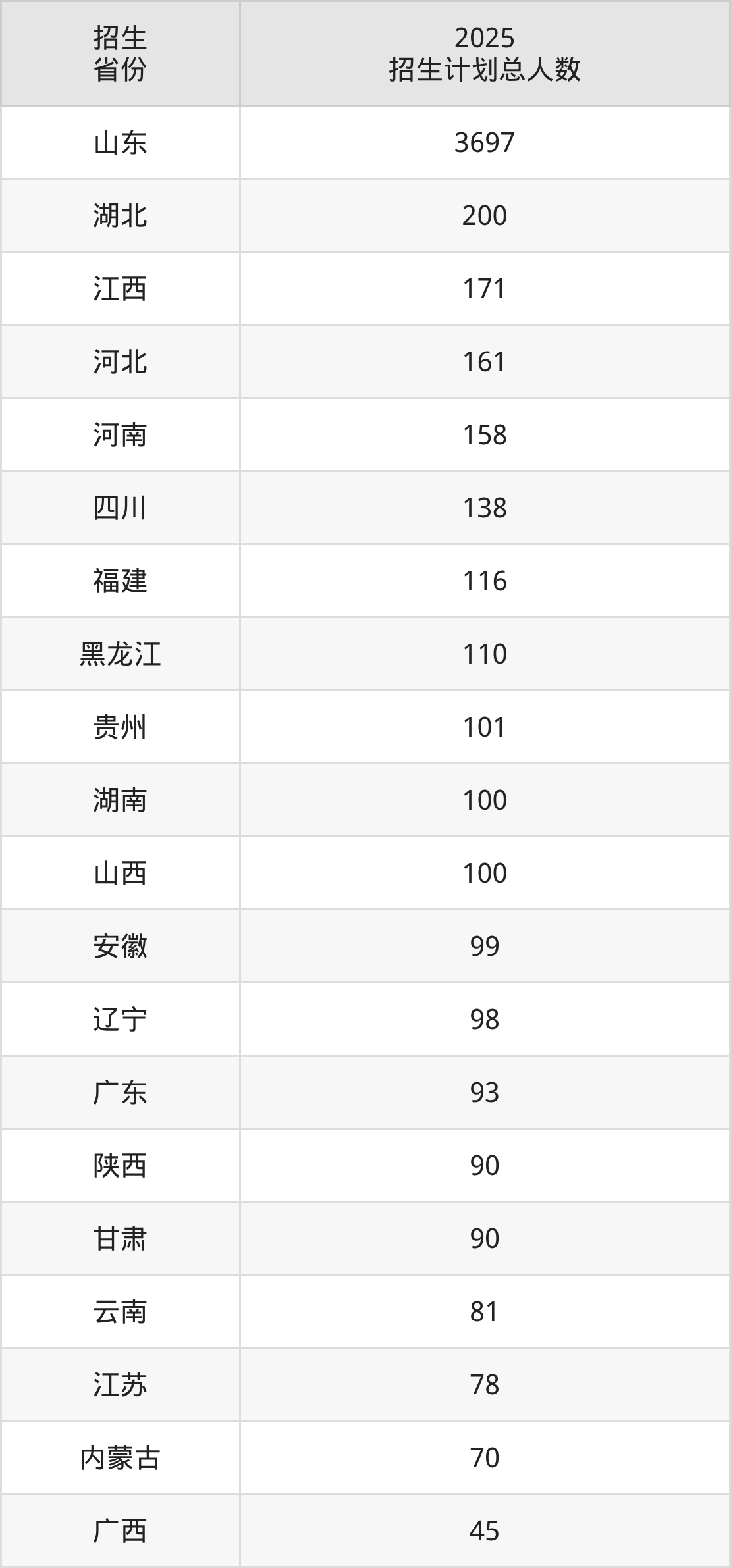2025年齐鲁工业大学面向全国26个省市开展本科招生;招生专业共50个,招生人数共5956人。2025年在山东省招生计划总人数是3697人,其中,齐鲁工业大学在山东省招生人数最多的是工商管理类。齐鲁工业大学在各省具体招生人数情况如下表。